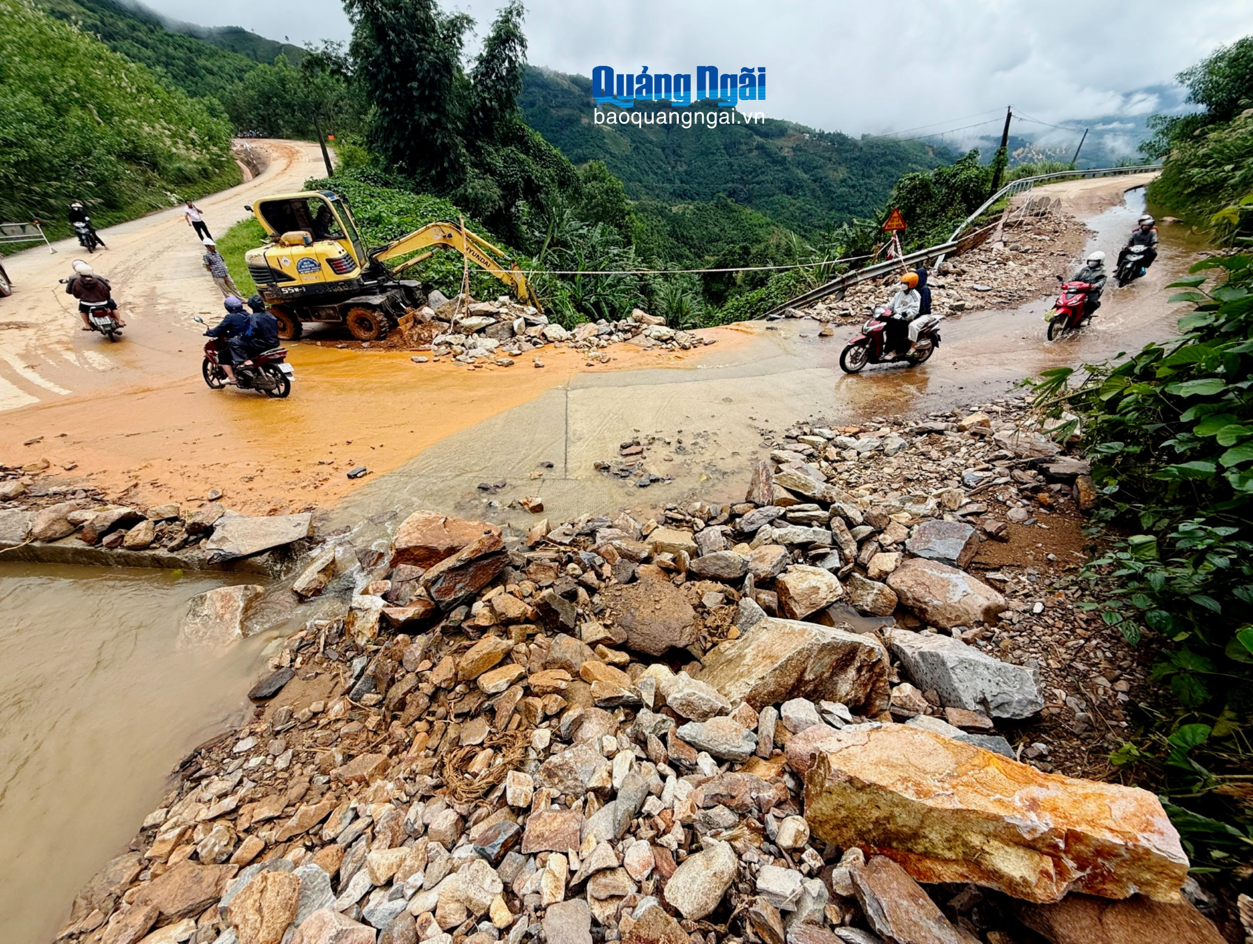 Đơn vị thi công đã huy động phương tiện cơ giới xúc hết lượng đá tràn ra lòng đường để giải phóng ách tắc trên bề mặt đường. Song song đó, tập trung xử lý tạm thời tình trạng sạt lở ta - luy dương, để người dân đi lại an toàn.
