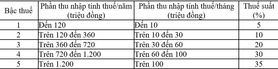 Đối với kỳ tính thuế năm 2026, kể từ ngày 1-1-2026, theo Luật Thuế thu nhập cá nhân số 109/2025/QH15, thu nhập từ tiền lương, tiền công của cá nhân cư trú được áp dụng biểu thuế lũy tiến từng phần gồm 5 bậc thuế.
