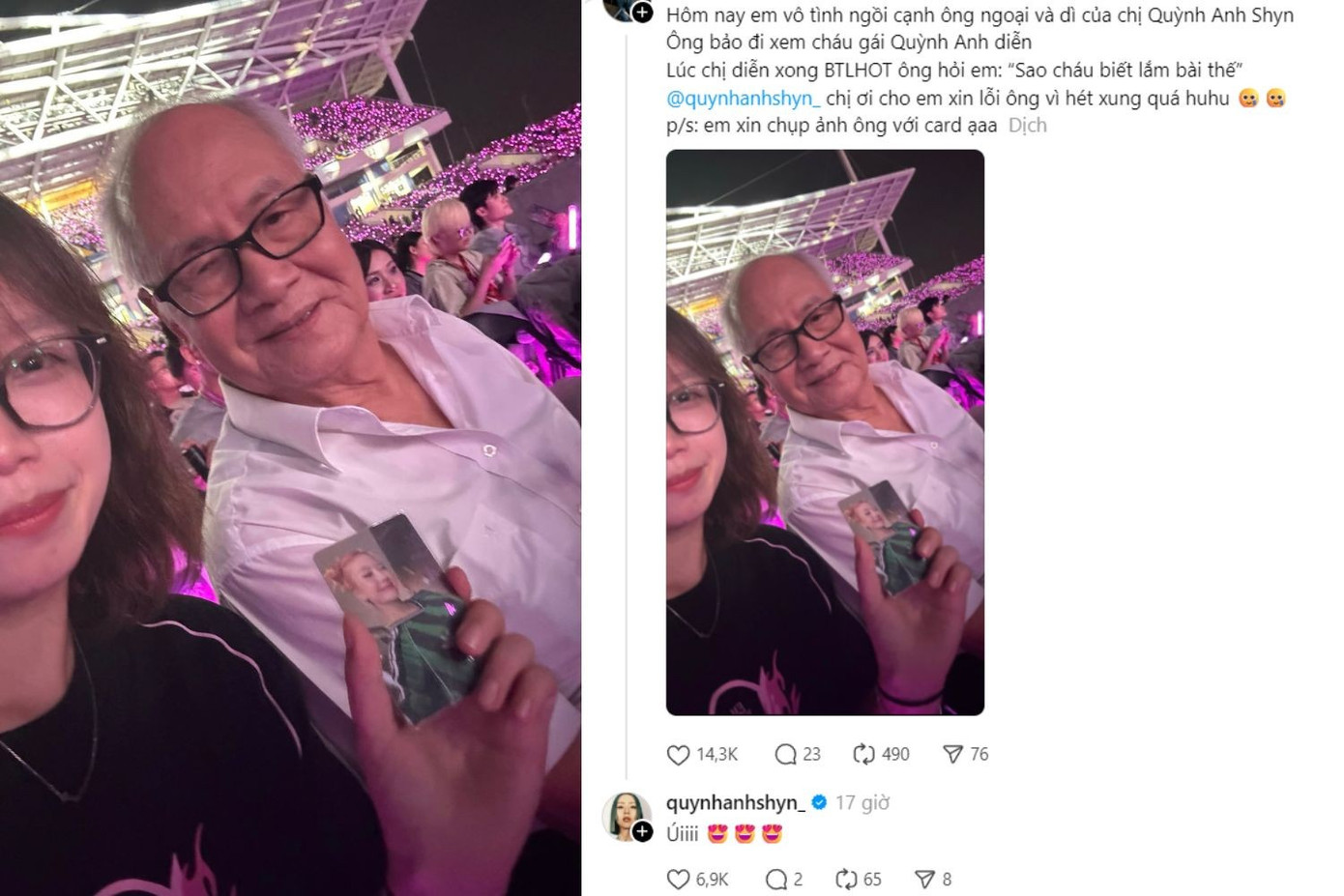 Ngay sau đó, Quỳnh Anh Shyn đã để lại bình luận thể hiện sự hạnh phúc, trân trọng tình cảm của vị khán giả đặc biệt. Ngoài ra, dì của Quỳnh Anh Shyn - người đồng hành cùng ông cũng thích thú tiết lộ: "Bình thường ngồi nghe bà hát 10 phút là ông vào phòng nằm. Hôm nay ngồi xem cháu gái diễn 4 tiếng trộm vía vẫn khỏe".