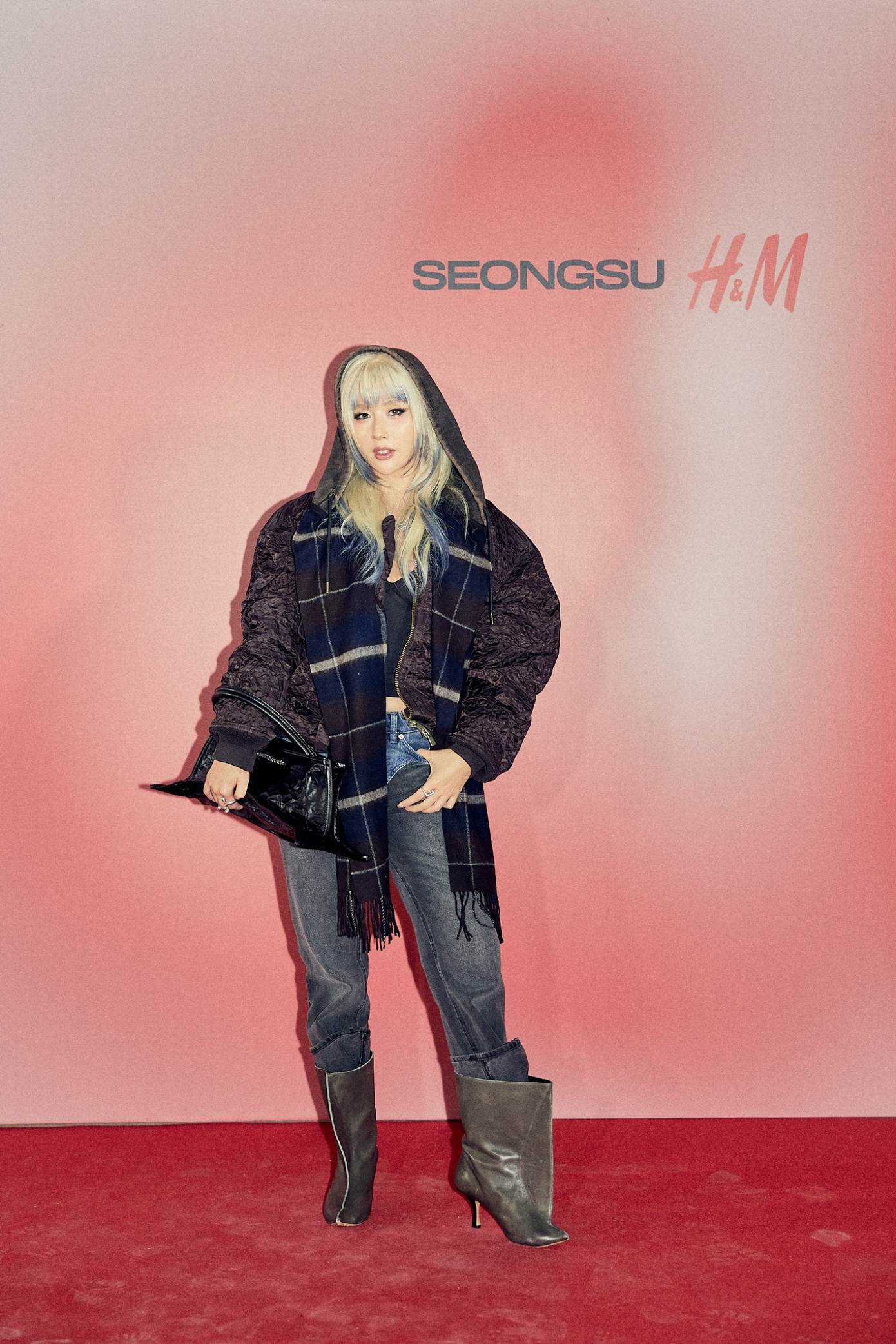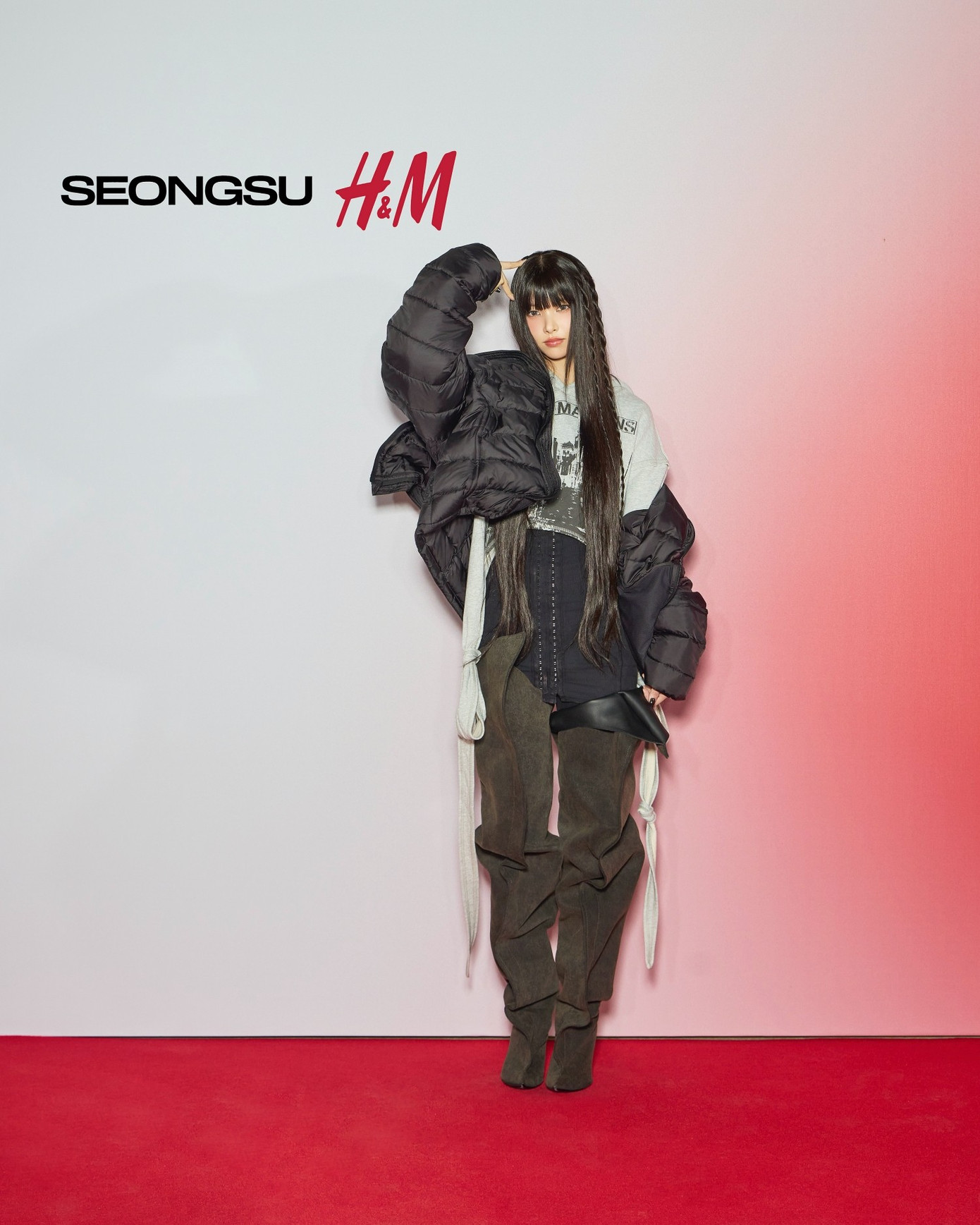 Nữ idol Yunah của nhóm ILLIT nổi tiếng với cách tiếp cận thời trang mới mẻ, đã thể hiện cá tính bằng cách layer một chiếc váy đen, áo hoodie xám in hình và áo phao có gọng theo một cách khác lạ. Điểm nhấn là đôi bốt siêu cao đặc trưng của Martens được làm lại đặc biệt cho bộ sưu tập.