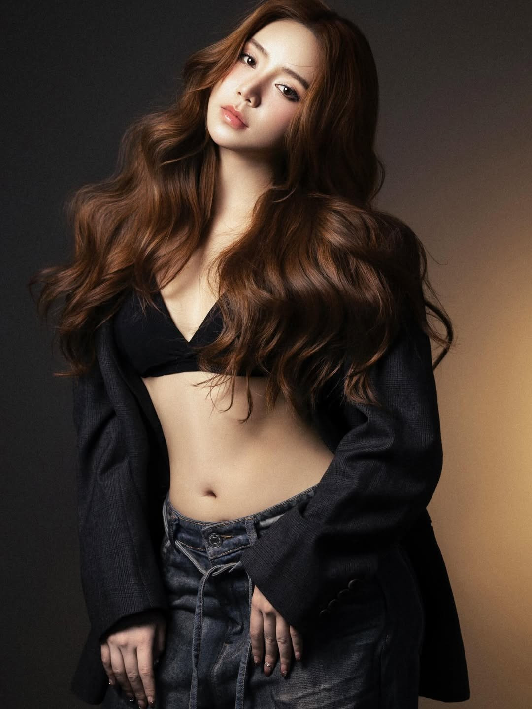 Tone màu tối của trang phục kết hợp ánh sáng vàng ấm phía sau tạo hiệu ứng tương phản, giúp Quỳnh Kool nổi bật với thần thái sắc sảo và phong cách thời trang trưởng thành.