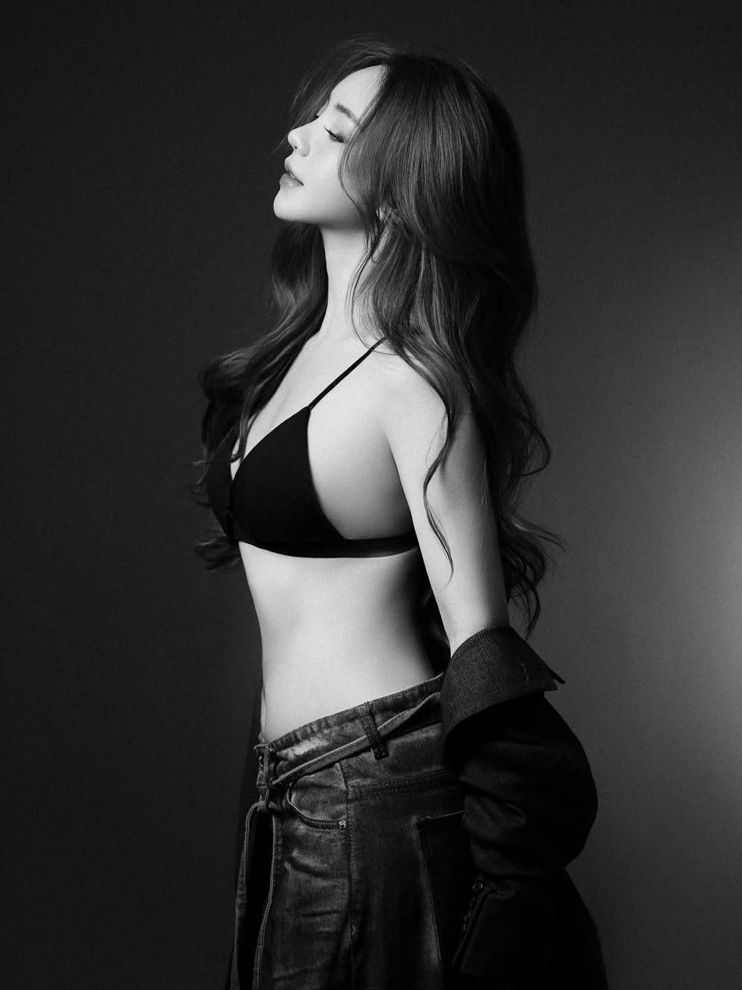 Trong loạt ảnh mới, Quỳnh Kool lựa chọn trang phục gồm bra-top đen kết hợp blazer dáng rộng và quần jeans ống rộng rách nhẹ. Set đồ gợi cảm nhưng không hề phản cảm, tôn trọn vòng eo nhỏ, bờ vai thon và thân hình cân đối của nữ diễn viên.