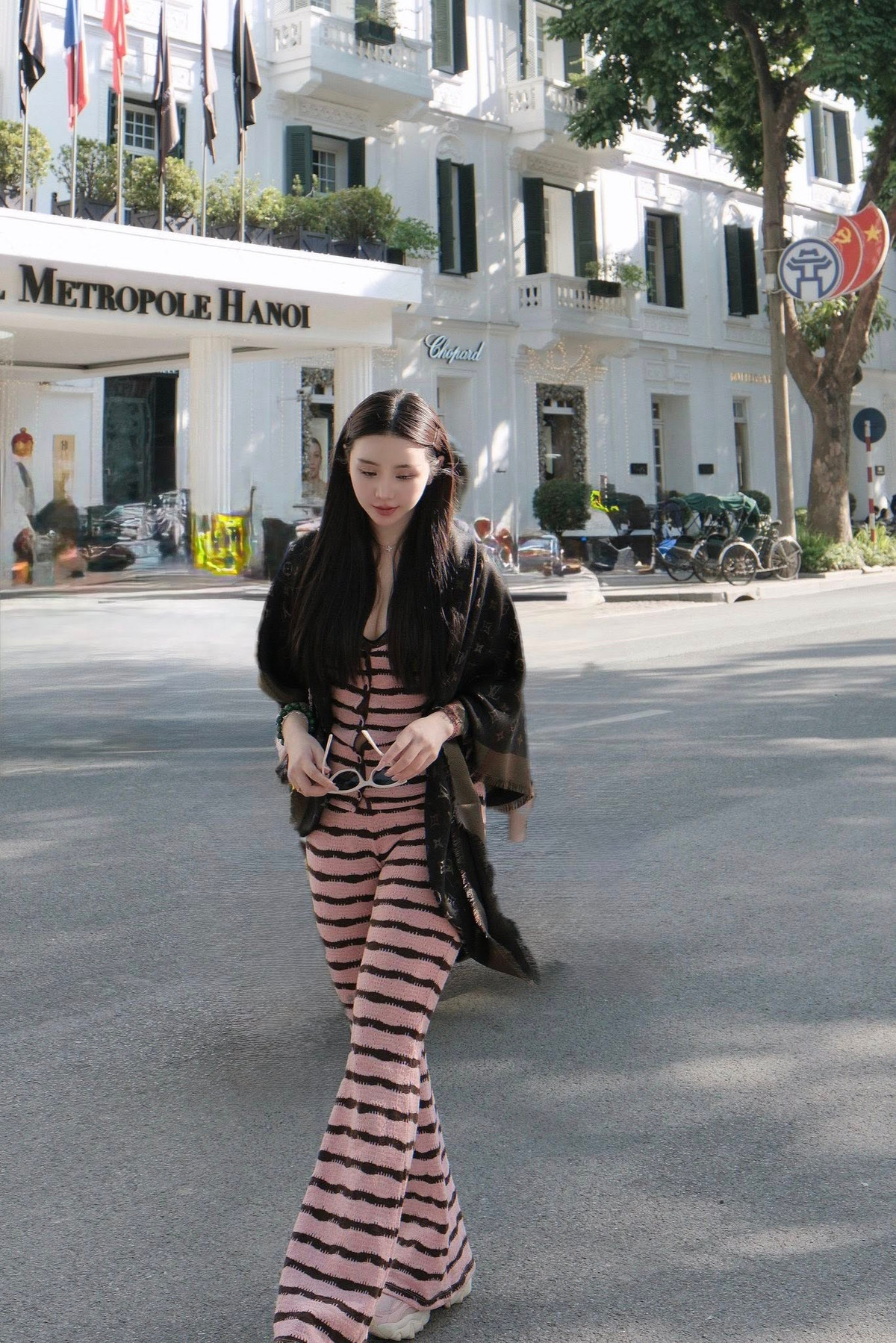 Diện bộ trang phục màu hồng ngọt ngào nhưng không kém phần táo bạo, nữ diễn viên để lộ vòng một gợi cảm với chi tiết cổ khoét sâu, tạo điểm nhấn nổi bật giữa không gian dịu nhẹ của buổi chiều Hà Nội.