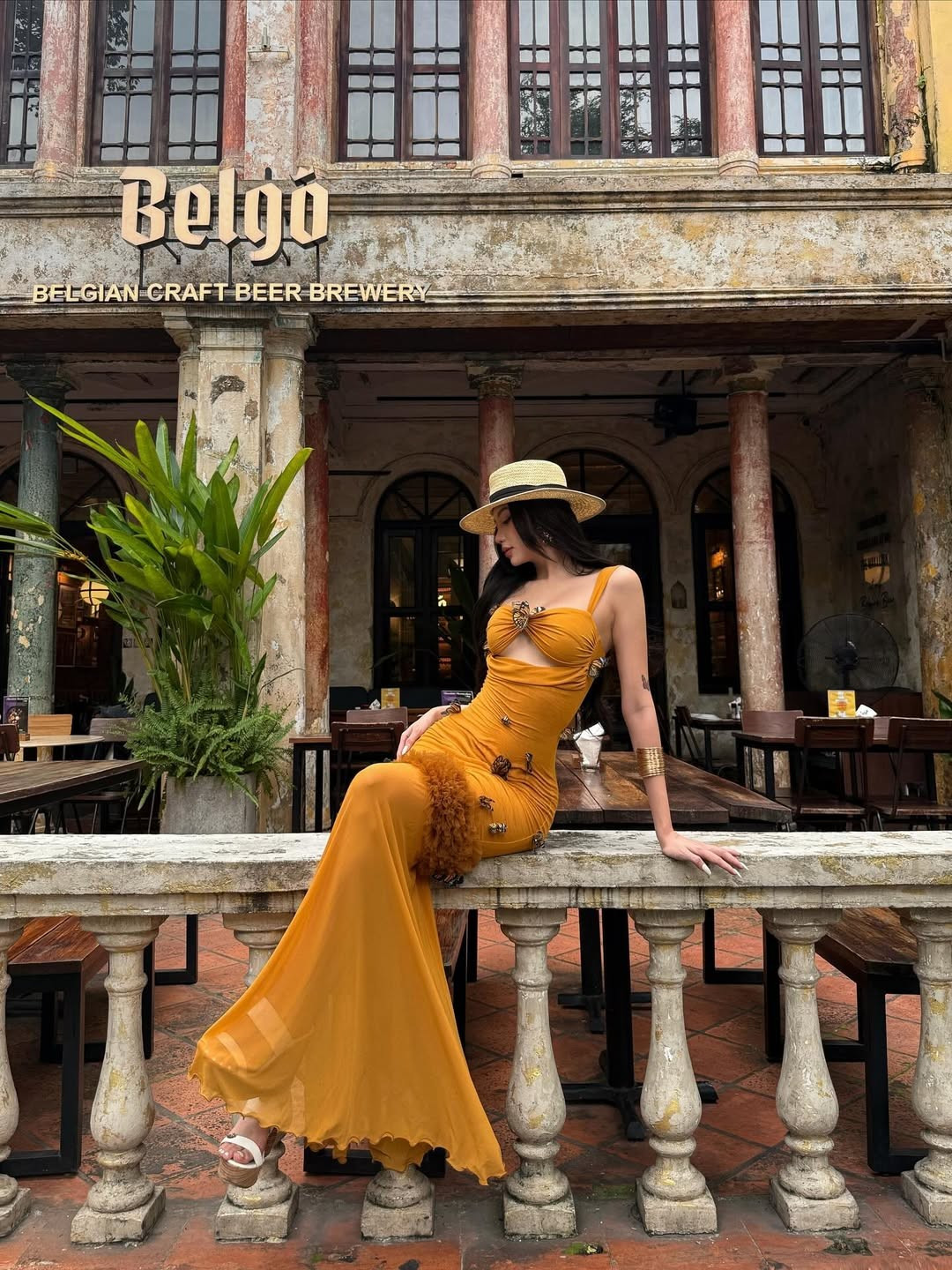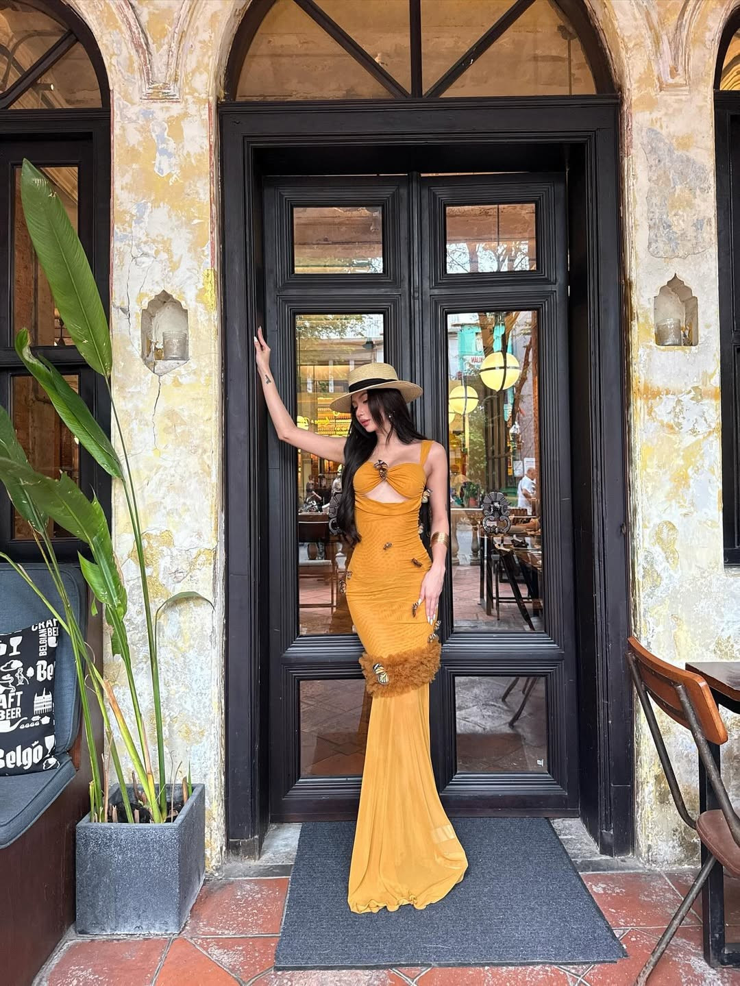 Cô nàng diện chiếc đầm dài hai dây ôm sát, mang sắc vàng mù tạt nổi bật. Thiết kế của chiếc váy được đánh giá là vô cùng táo bạo và tinh tế. (Ảnh: IGNV)