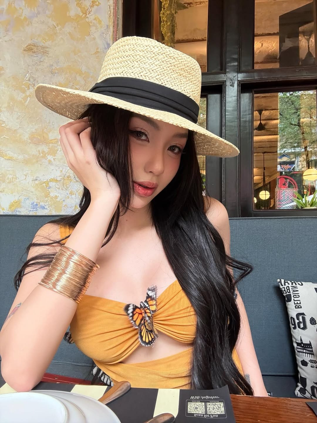 Quỳnh Như hoàn thiện vẻ ngoài của mình bằng chiếc mũ cói vành rộng, dây băng đen, cùng bộ vòng tay kim loại bản lớn. (Ảnh: IGNV)