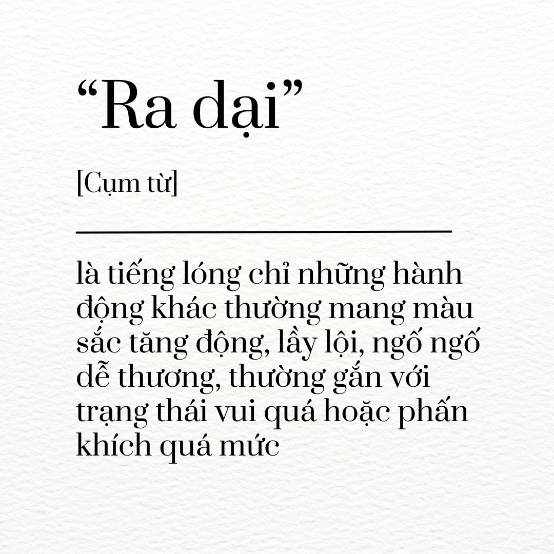 Còn trong ngôn ngữ gen Z vẫn được dùng phổ biến trên mạng xã hội hiện tại, “ra dại” là tiếng lóng chỉ những hành động khác thường mang màu sắc tăng động, lầy lội, ngố ngố dễ thương, thường gắn với trạng thái vui quá hoặc phấn khích quá mức. Nó được dùng để mô tả sự bùng nổ cảm xúc tích cực, hài hước chứ không hề có ý chê bai hay tiêu cực.