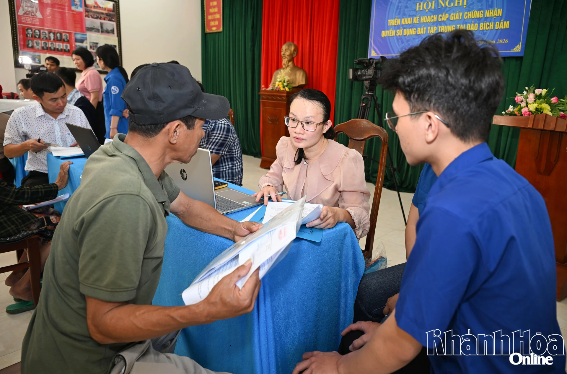 Sáng 3-4, Tổ dân phố Bích Đầm tấp nập hơn bình thường. Trên những con đường nhỏ, nhiều người dân cầm giấy tờ nhà đất đến Đồn Biên phòng Bích Đầm - nơi tổ chức Hội nghị triển khai cấp GCN tập trung của UBND phường Nha Trang. Dự hội nghị, người dân chăm chú nghe thông báo về lộ trình cấp GCN, vỗ tay rào rào khi lãnh đạo phường cam kết tiến độ. Từng người được hướng dẫn chuẩn bị các loại giấy tờ, hỗ trợ viết đơn đăng ký cấp GCN, nghe hướng dẫn xác nhận trích lục thửa đất... 12 giờ, người dân chưa về, tổ công tác lưu động cũng chưa nghỉ.