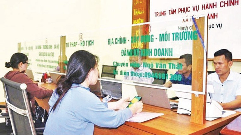 Cán bộ, nhân viên Trung tâm Phục vụ hành chính công xã Tân Thành, tỉnh Quảng Trị giải quyết các thủ tục hành chính cho người dân. (Ảnh HG)