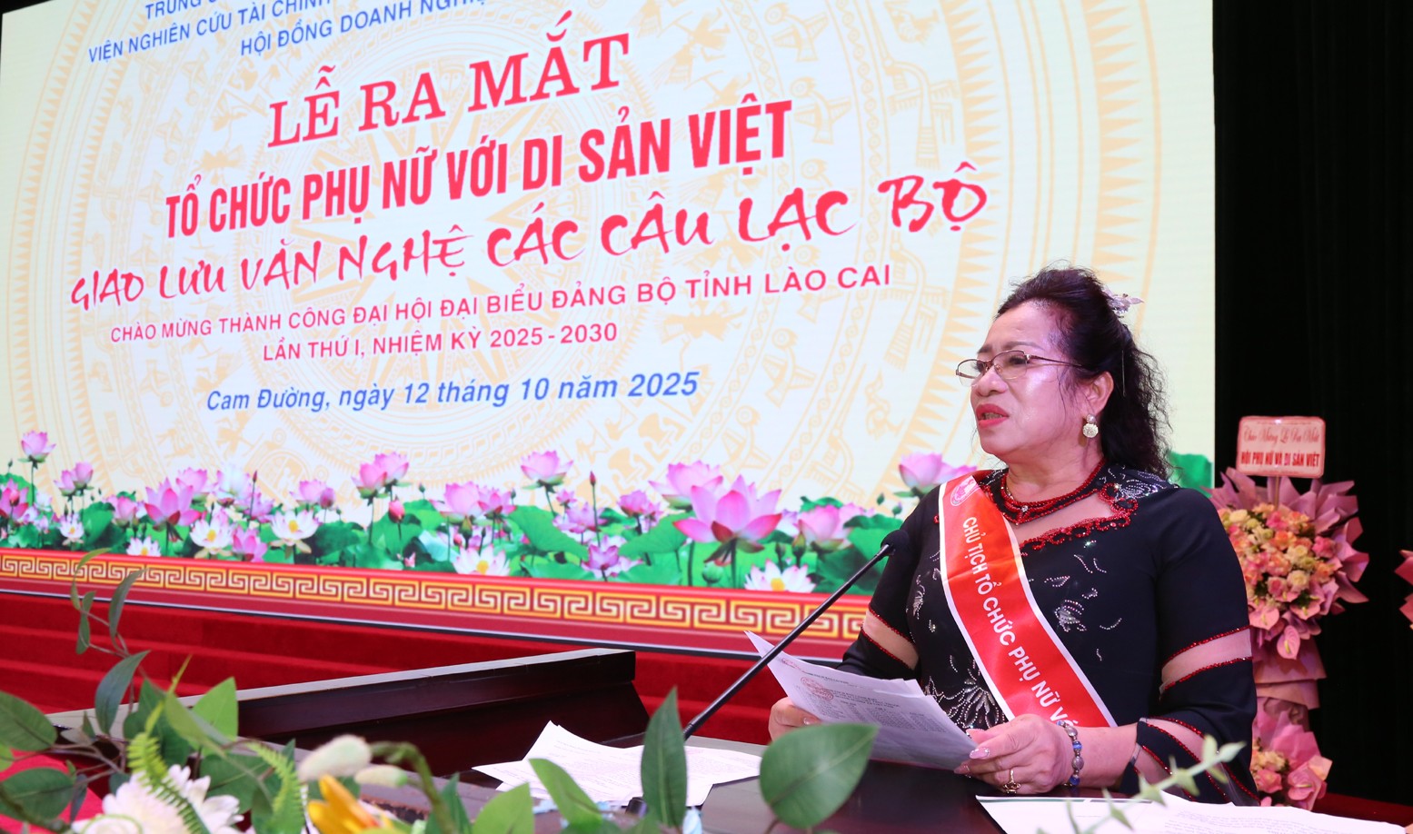 Phát biểu tại buổi lễ, bà Nguyễn Thị Nhẫn, Chủ tịch Tổ chức Phụ nữ với Di sản Việt tại Lào Cai cam kết cùng Ban lãnh đạo xây dựng tổ chức trở thành cầu nối giữa phụ nữ và di sản, góp phần khơi dậy tinh thần sáng tạo, khởi nghiệp từ văn hóa truyền thống.