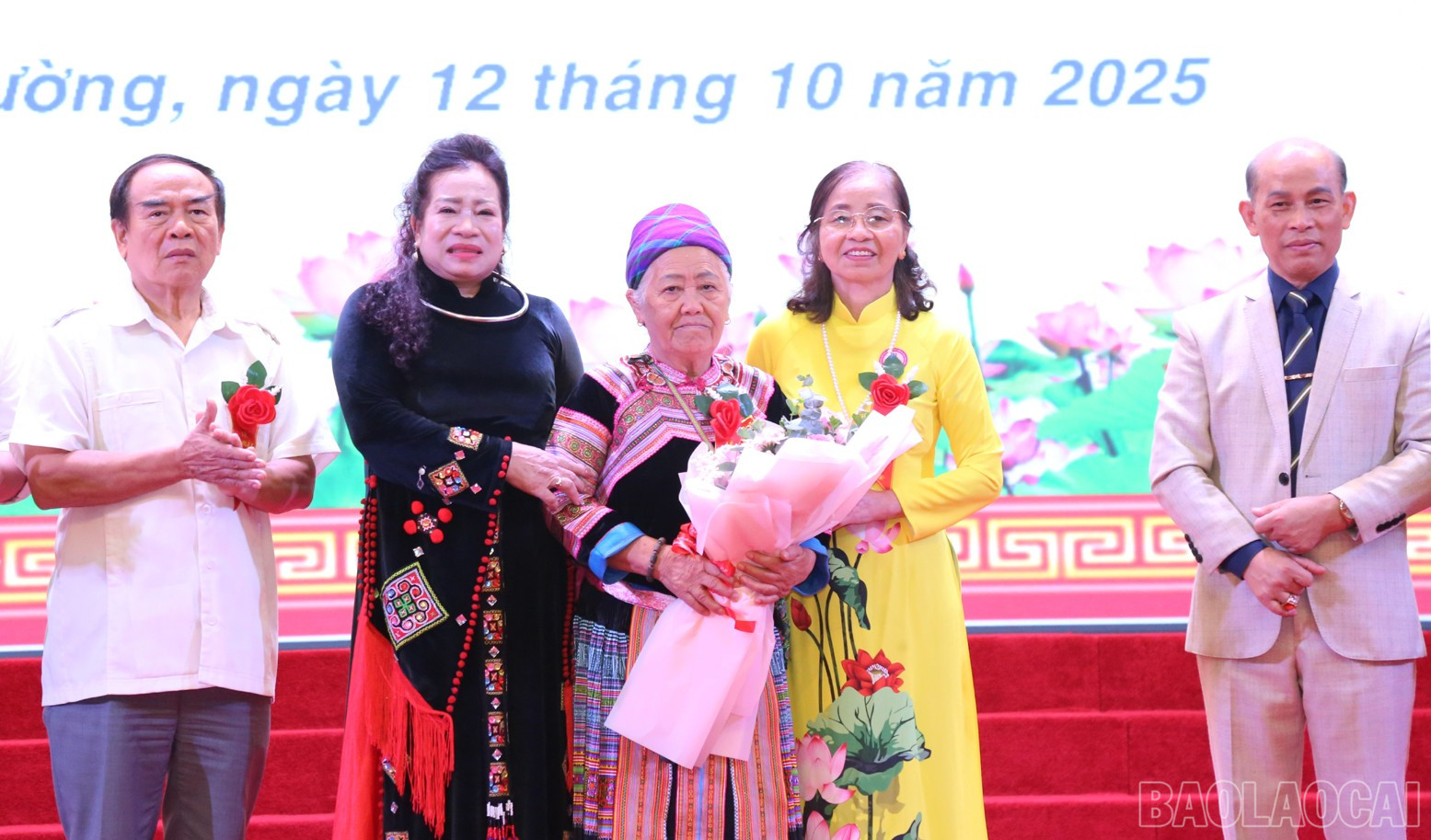Tặng hoa chúc mừng Ban sáng lập, Ban cố vấn và Ban lãnh đạo Tổ chức Phụ nữ với Di sản Việt tại Lào Cai.