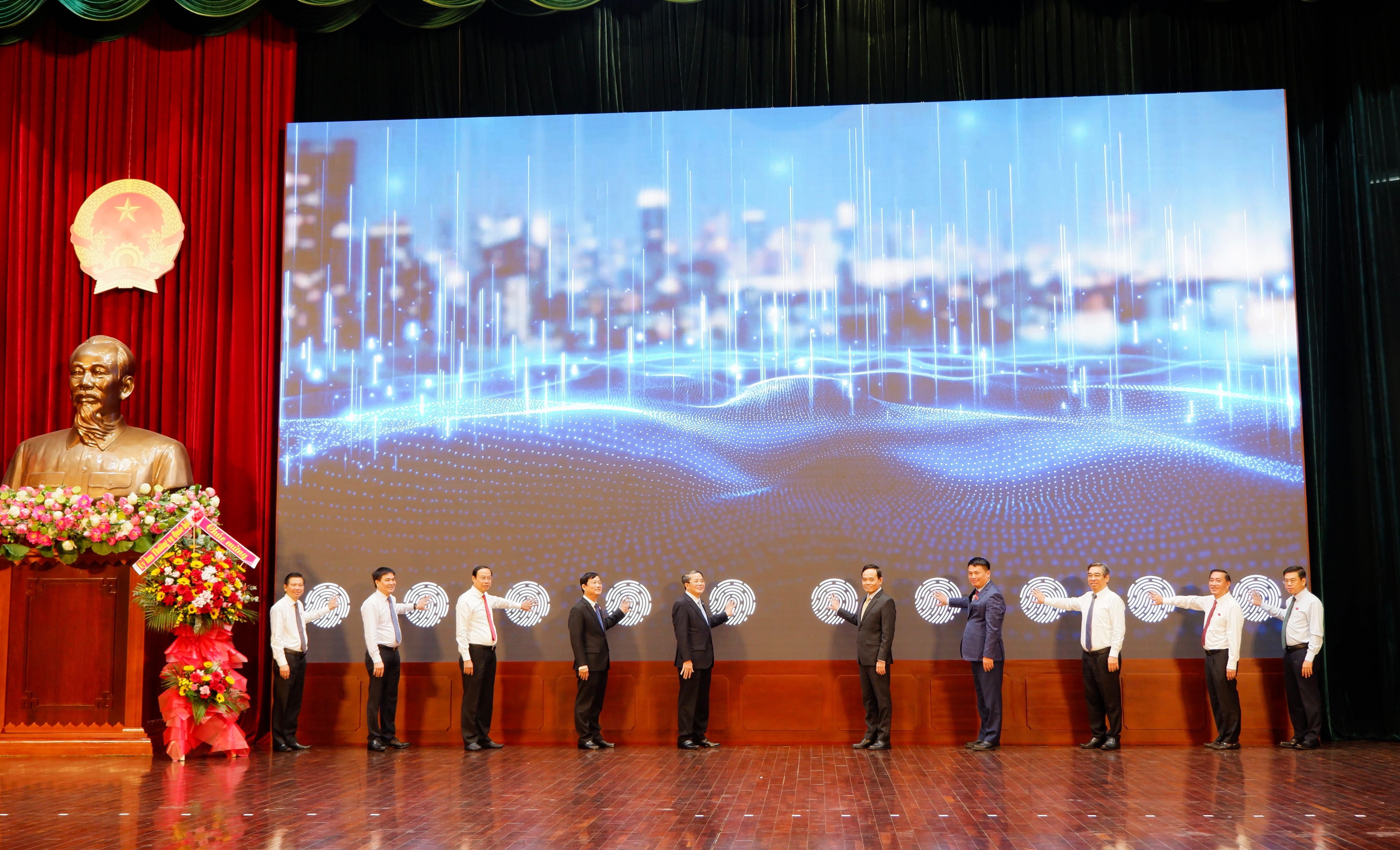 Phó Chủ tịch Quốc hội Nguyễn Đức Hải, Bí thư Thành ủy TP. Hồ Chí Minh Trần Lưu Quang cùng các đại biểu thực hiện nghi thức công bố nền tảng ứng dụng HĐND số TP. Hồ Chí Minh và Cổng thông tin điện tử. Ảnh: Hoa Lê