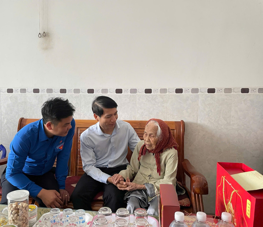 Phó Bí thư Tỉnh ủy Nguyễn Ngọc Lương (giữa) cùng đoàn viên, thanh niên thăm, tặng quà cho Mẹ Việt Nam anh hùng Lê Thị Hàng. Ảnh: Thế Huynh