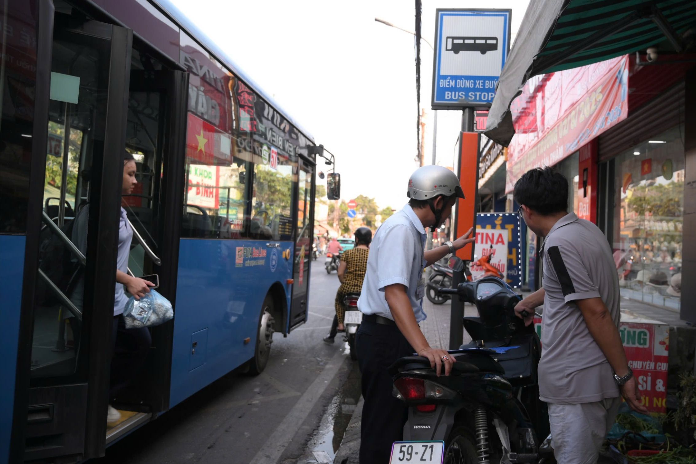 Nhiều điểm dừng xe buýt được lực lượng chức năng tập trung tuyên truyền, nhắc nhở các hộ kinh doanh không buôn bán, lấn chiếm vỉa hè, đảm bảo lối đi thông thoáng cho hành khách. Ảnh: PHẠM HẢI