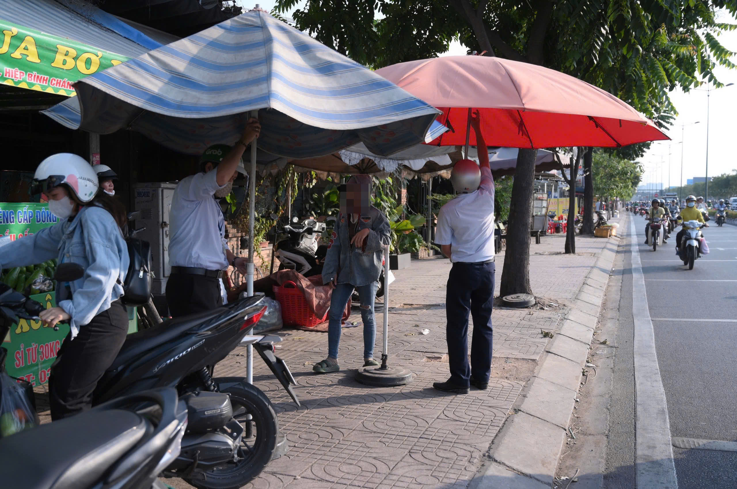 Lực lượng chức năng tiến hành tháo dỡ các mái che, bạt dù lấn chiếm vỉa hè trên đường Hiệp Bình, trả lại lối đi cho người đi bộ và góp phần chỉnh trang mỹ quan đô thị. Ảnh: PHẠM HẢI