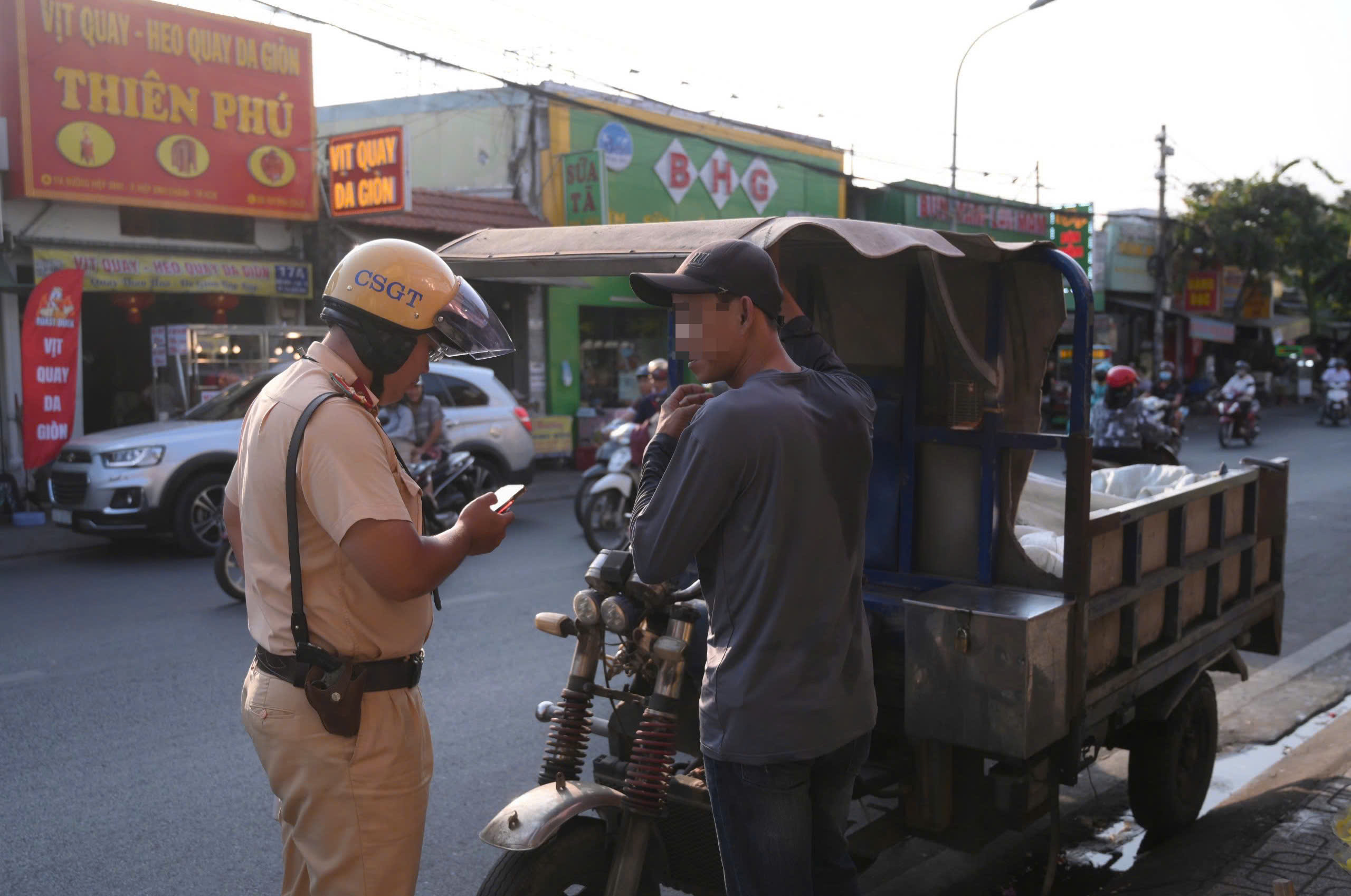 Tổ công tác kiểm tra một xe ba bánh đậu ngược chiều trên đường, phát hiện tài xế không có giấy phép lái xe và giấy đăng ký, tiến hành lập biên bản, tạm giữ phương tiện theo quy định. Ảnh: PHẠM HẢI