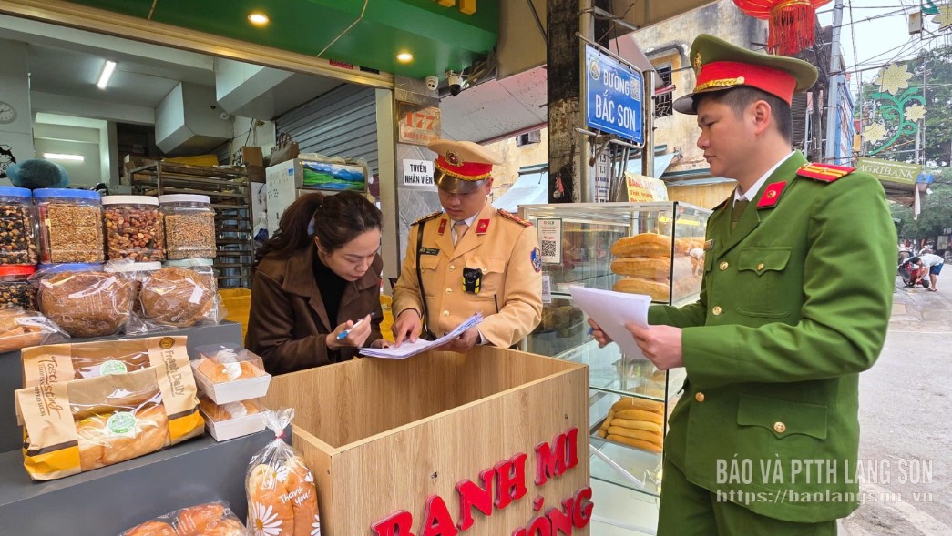 Lực lượng chức năng tuyên truyền các quy định về đảm bảo ATGT, trật tự đô thị đến hộ kinh doanh tại đường Bắc Sơn (phường Kỳ Lừa)