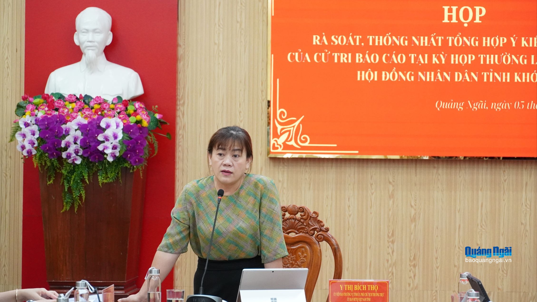 Phát biểu tại cuộc họp, Ủy viên Ban Thường vụ Tỉnh ủy, Phó Chủ tịch Thường trực Ủy ban MTTQ Việt Nam tỉnh Y Thị Bích Thọ yêu cầu Ban Dân chủ - Pháp luật hoàn chỉnh báo cáo để các sở, ngành và UBND tỉnh tham gia ý kiến, chắt lọc ý kiến và biên tập đảm bảo các ý kiến, kiến nghị của cử tri đều được quan tâm, xem xét; đồng thời thể hiện đúng thực chất tình hình thực tế ở địa phương hiện nay.