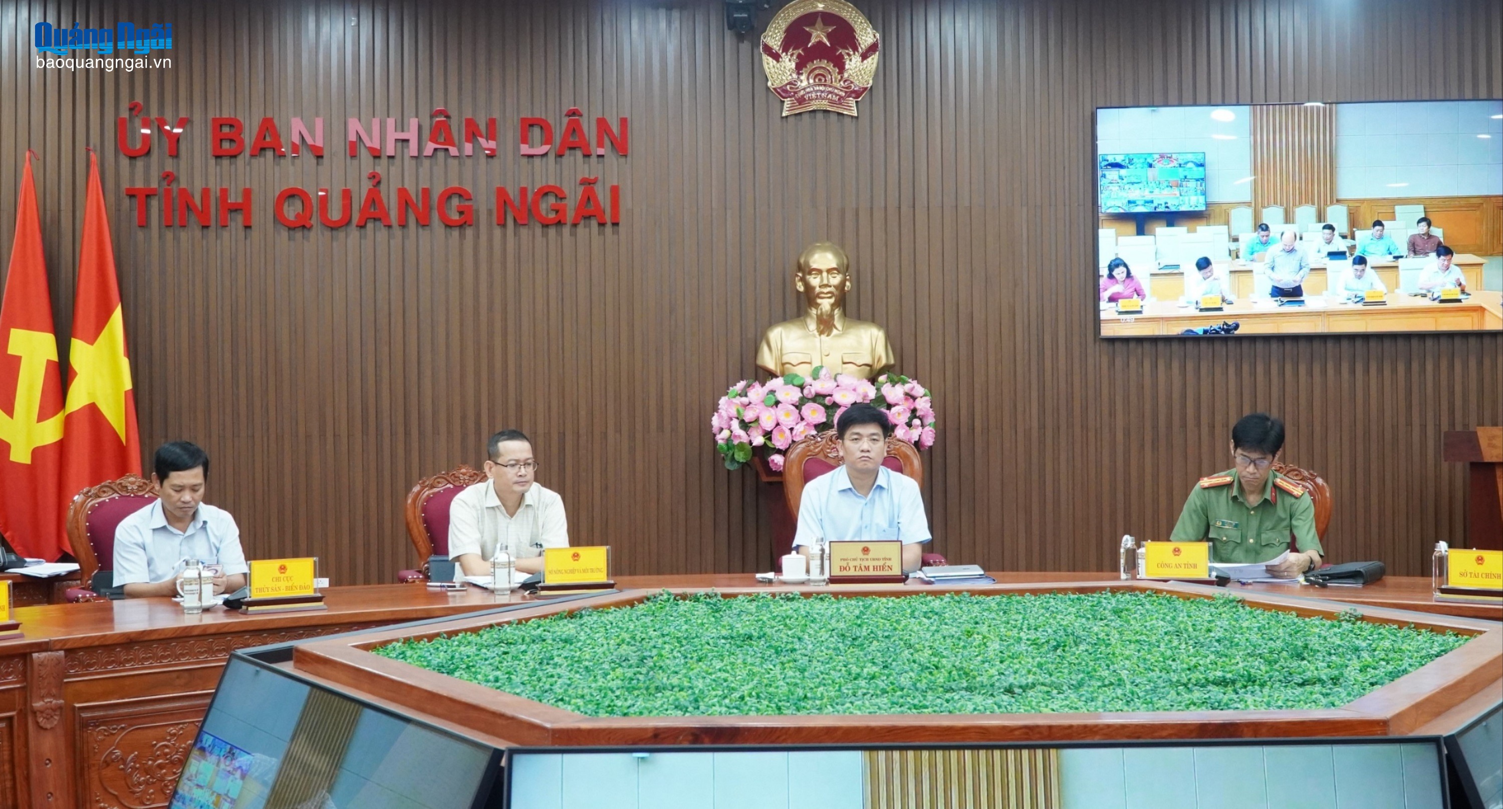 Phó Chủ tịch UBND tỉnh Đỗ Tâm Hiển và lãnh đạo các sở, ngành, UBND các xã, phường giáp biển dự họp trực tuyến tại điểm cầu tỉnh.