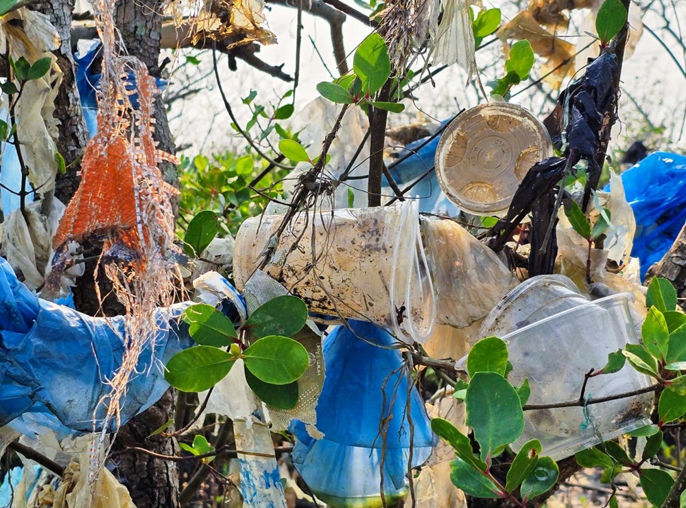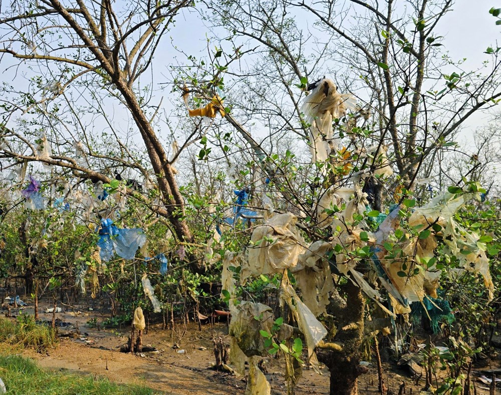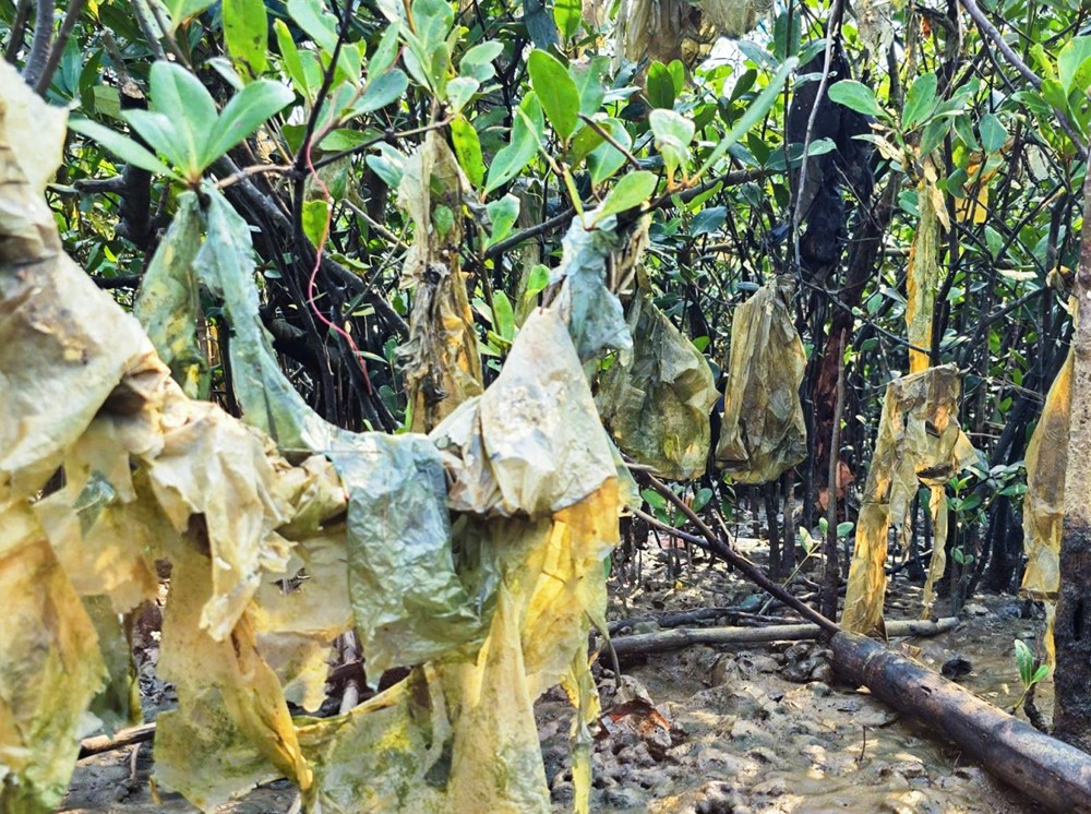 Túi ni lông, bao bì nhựa quấn chặt vào thân cây bần