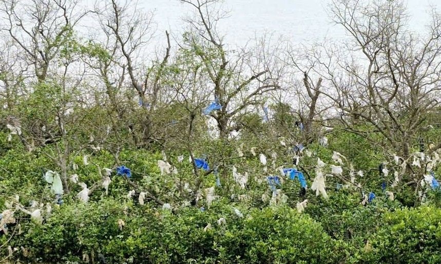 Theo ghi nhận, rác không chỉ tập trung dưới mặt đất hay trôi trên sông mà còn bám kín trên thân và cành cây. Nhiều mảng ni lông quấn chặt vào thân bần, treo lơ lửng theo gió, khiến cảnh quan trở nên nhếch nhác. Có những khu vực, rác phủ gần kín tán cây khiến cả cánh rừng như biến thành nơi tập kết rác tự phát.