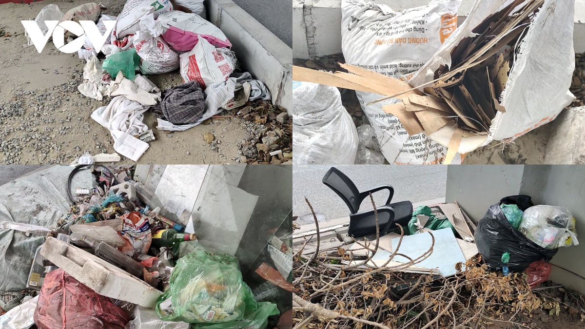 Đủ các thể loại rác, từ rác sinh hoạt đến rác thải xây dựng, vật liệu hư hỏng,... bị vứt bừa bãi dưới chân cầu vượt cạn.