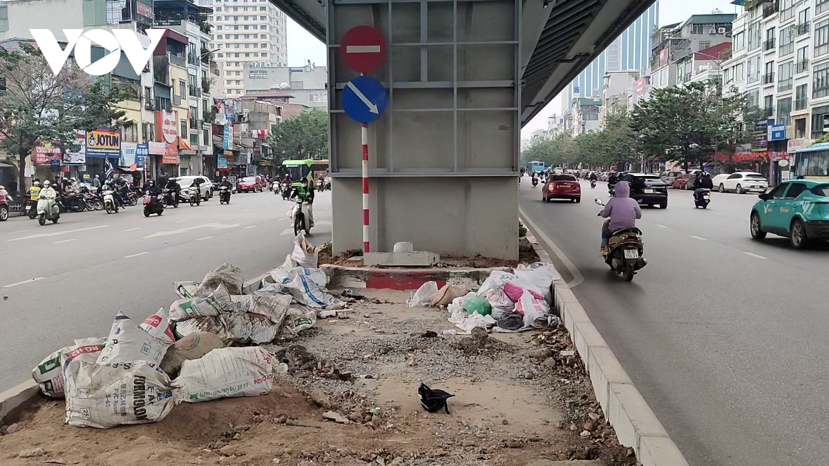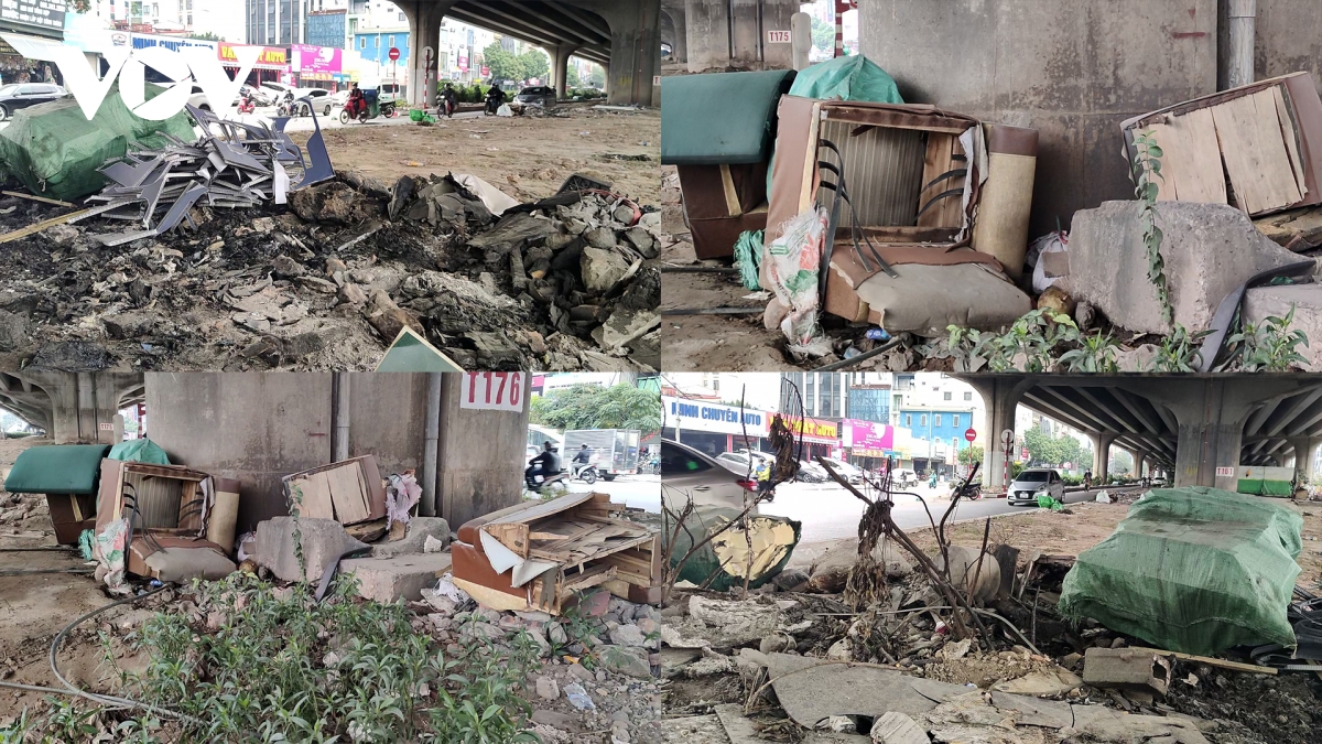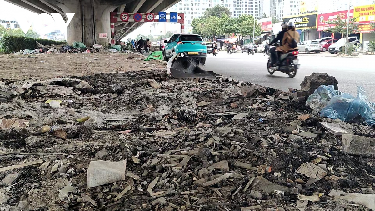 Vành đai 2 khu vực Minh Khai, dưới các chân cầu là điểm tập kết rác, vật liệu xây dựng.