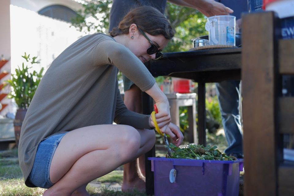 Du khách nước ngoài thực hành công đoạn xử lý rác thải hữu cơ, chủ yếu là thực phẩm dư thừa, trước khi ủ thành phân bón cho vườn rau tại một nhà hàng ở Đà Nẵng. Ảnh: Lê Hoàng Hà