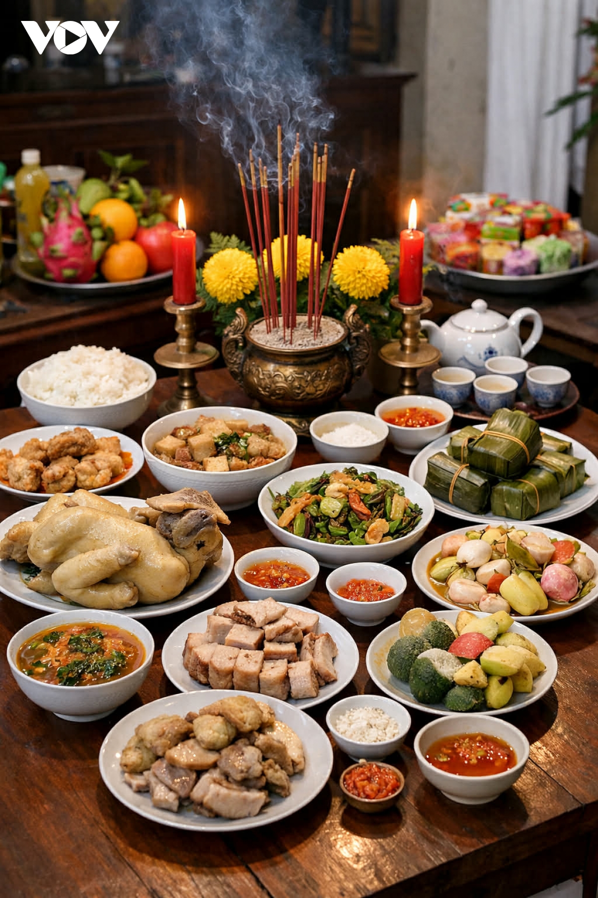 Mâm cỗ dâng tổ tiên được bày biện trang trọng, thể hiện đạo hiếu và sự tri ân nguồn cội trong mỗi gia đình Việt.