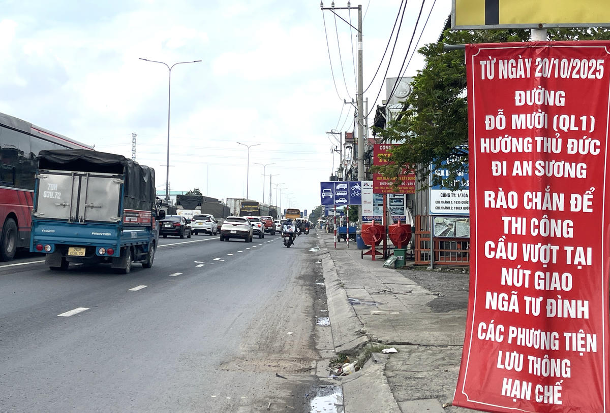 Mấy ngày gần đây, khi bắt đầu thi công dự án cầu vượt nút ngã tư Đình nằm trên đường Đỗ Mười (tức Quốc lộ 1A, khu vực phường Tân Thới Hiệp, TPHCM), lực lượng chức năng đã rào chắn, dựng lô cốt bằng tôn ở một làn đường dọc tuyến Quốc lộ 1A phục vụ việc thi công. Do đây là trục đường huyết mạch qua địa bàn, lưu lượng phương tiện rất đông nên việc rào một phần đường đã ảnh hưởng rất nhiều tới việc lưu thông đi lại của người dân. Tuy nhiên, ghi nhận thực tế ngày 5/11 cho thấy, mặc dù xảy ra tình trạng ùn ứ dòng phương tiện trên Quốc lộ 1A nhưng tình trạng chưa quá nghiêm trọng. Các phương tiện vẫn di chuyển chậm qua khu vực này trong khi ở phía đường Nguyễn Văn Quá và Nguyễn Thị Đặng, các phương tiện phải di chuyển đường vòng do nút giao đã bị phong tỏa. Người dân ở 2 phía đường không thể băng qua quốc lộ 1A mà phải di chuyển vòng xuống nút giao kế tiếp rồi quay ngược lại.