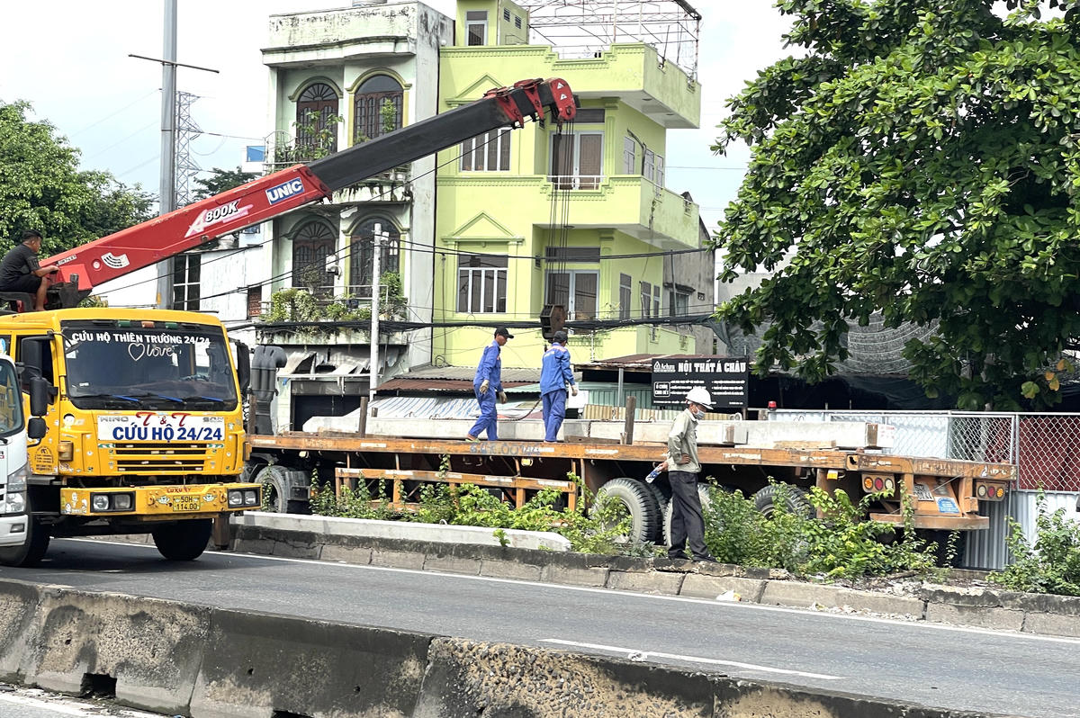 Nhà thầu thi công lắp rào chắn, tập kết vật liệu xây dựng trên Quốc lộ 1A. Ảnh: Đ.Xá.