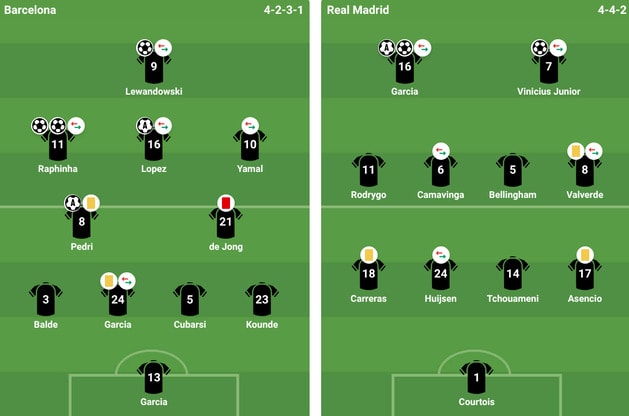 Ghi bàn: Barcelona (Raphinha 36' 73', Lewandowski 45+4'); Real Madrid (Vinicius Jr 45+2', Gonzalo Garcia 45+6')