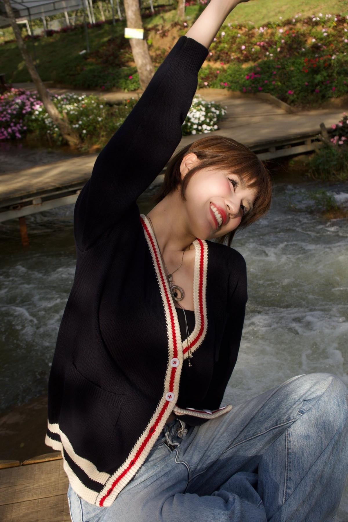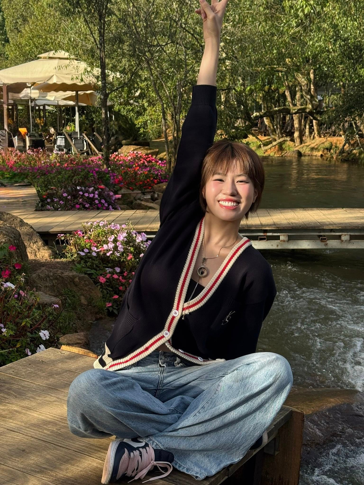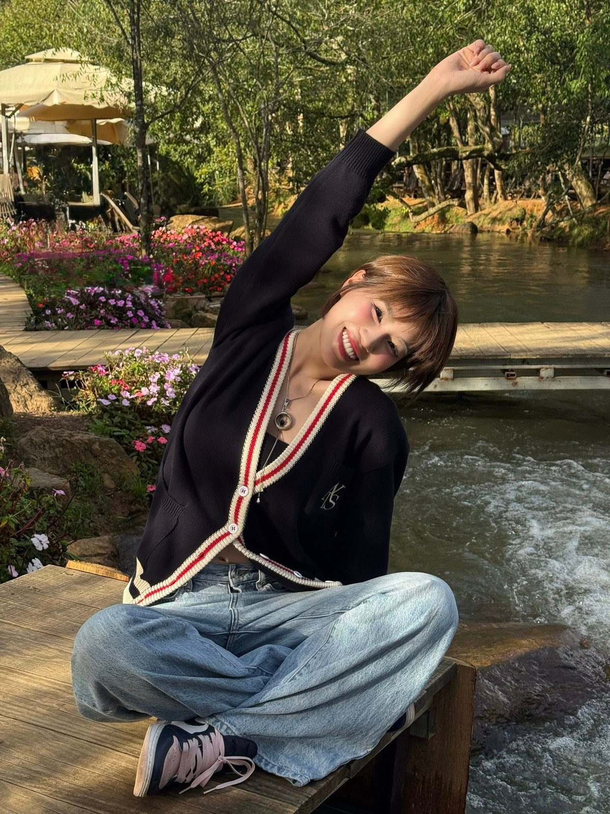 Cô diện một chiếc áo khoác cardigan len màu đen viền trắng-đỏ, kết hợp với quần jeans ống rộng, tạo nên sự cân bằng giữa nét trẻ trung, năng động và một chút cổ điển, cá tính. (Ảnh: IGNV)