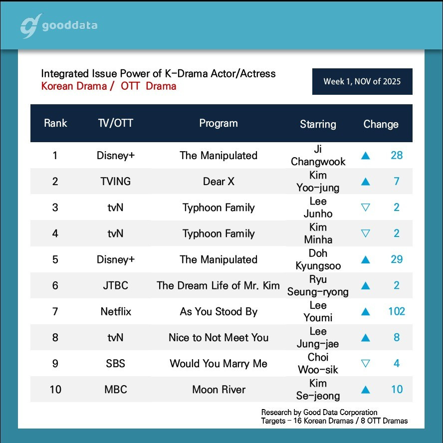Tuy nhiên, ở bảng diễn viên được quan tâm nhất, thứ hạng có sự xáo trộn lớn so với tuần trước và không tương ứng với bảng phim. Nếu thời gian trước, Typhoon Family và cặp đôi chính liên tục dẫn đầu cả hai bảng thì hiện tại, hạng 1 đã được "chiếm đóng", theo sau là , đẩy Lee Junho và Kim Min Ha xuống hạng 3 - 4. Yoo Jung là ngôi sao duy nhất của Dear X lọt Top 10. Cái tên khác của The Manipulated lọt Top là Do Kyung Soo (D.O.) ở hạng 5.