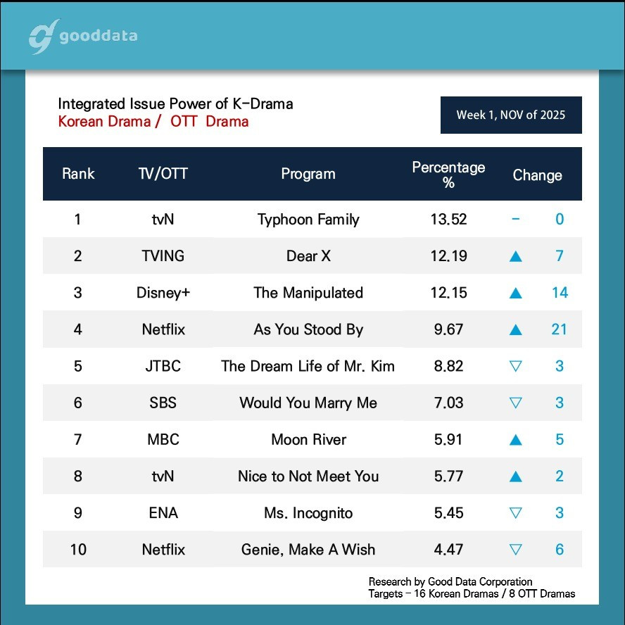 Tuy nhiên, Typhoon Family vẫn vững hạng 1 trong Top 10 phim Hàn đang phát sóng được quan tâm nhất tuần đầu tháng 11, theo thống kê của Good Data Corporation. Thời điểm khảo sát số liệu, và chỉ mới phát hành nhưng đã lập tức leo lên vị trí thứ 2 - 3.