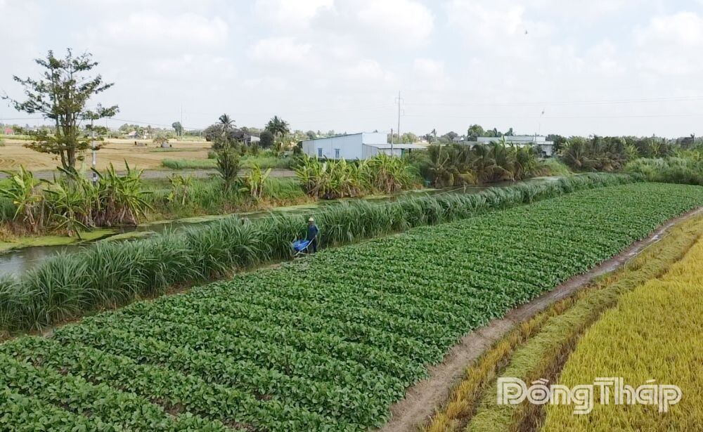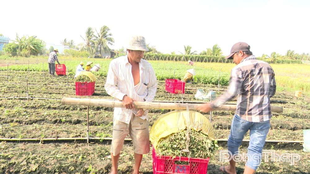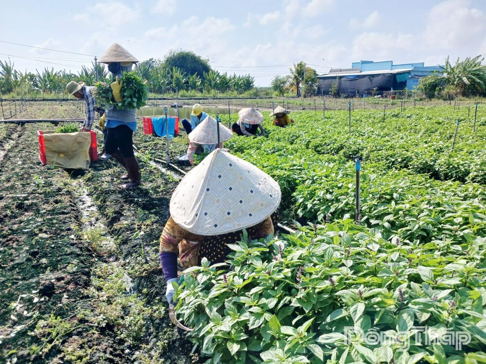Lúc chúng tôi đến là thời điểm ông Trương Hùng (ấp Hộ, xã Tân Điền, tỉnh Đồng Tháp) đang thuê nhân công thu hoạch 4 công rau quế của gia đình. Rau bán được giá 7.000 đồng/kg. Ông Hùng chia sẻ: “Vụ này năng suất rau không cao. Giá bán thấp quá, chi phí gì cũng tăng nên chỉ lời khoảng 1.000 đồng/kg”.