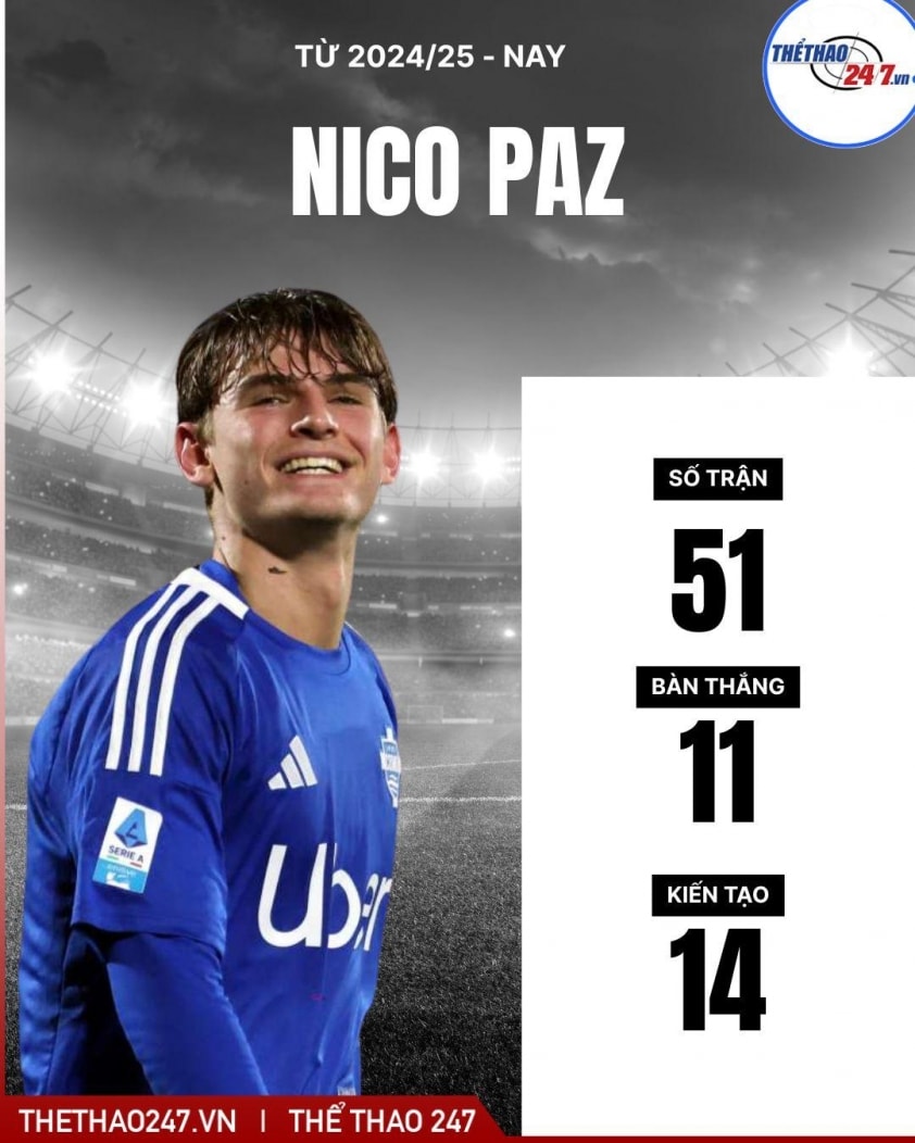 Thống kê cho thấy sự hiệu quả đáng kinh ngạc của Paz: sau 51 lần ra sân cho Como, anh đóng góp tới 11 bàn thắng và 14 đường kiến tạo. Màn trình diễn bùng nổ này ngay lập tức thu hút sự quan tâm đặc biệt từ hàng loạt đội bóng lớn tại Ngoại hạng Anh.