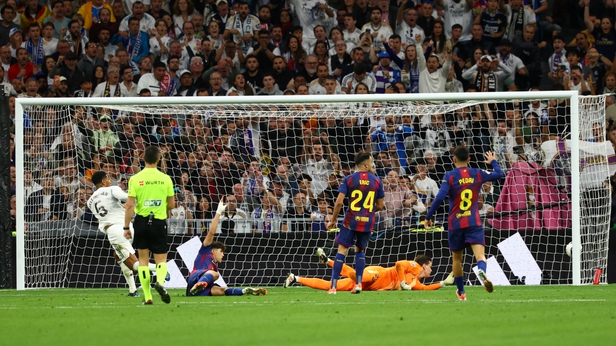 Sau khi bị từ chối bàn thắng, Real Madrid tiếp tục dâng cao đội hình tấn công và sớm được đền đáp. Phút 22, Jude Bellingham chọc khe tinh tế để Mbappe thoát xuống đối mặt với thủ môn Barcelona và dứt điểm gọn gàng mở tỷ số 1-0 cho “Kền kền trắng”. Sau bàn thua, Barcelona dồn lên tấn công và có cơ hội gỡ hòa ở phút 38, khi Fermin Lopez dứt điểm chính xác sau tình huống phản công nhanh, cân bằng tỷ số 1-1.