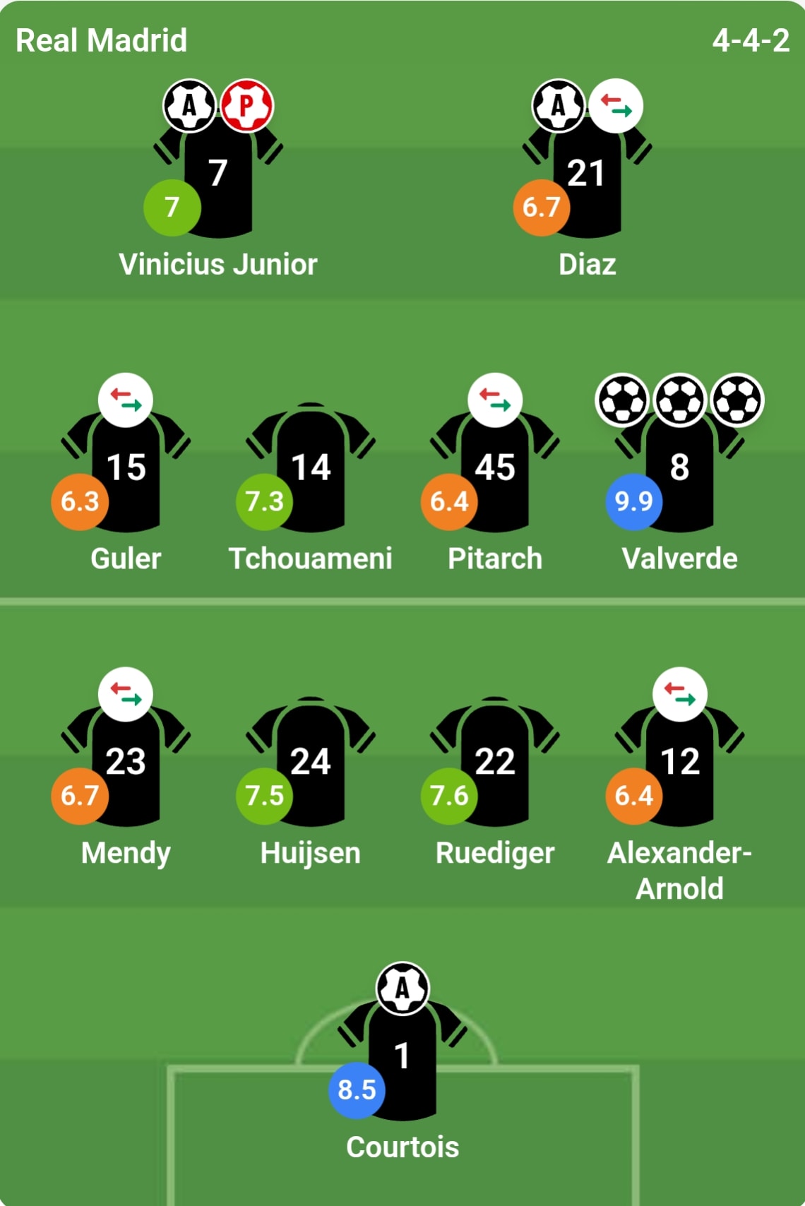 Thibaut Courtois - 8.5 điểm: Thực hiện 4 pha cứu thua và làm chủ không gian cực tốt, đặc biệt là trong các tình huống phạt góc của Manchester City. Có một pha cản phá "thần sầu" trong hiệp 2 và thậm chí còn trực tiếp đóng góp một đường kiến tạo vượt tuyến tuyệt vời cho Federico Valverde.