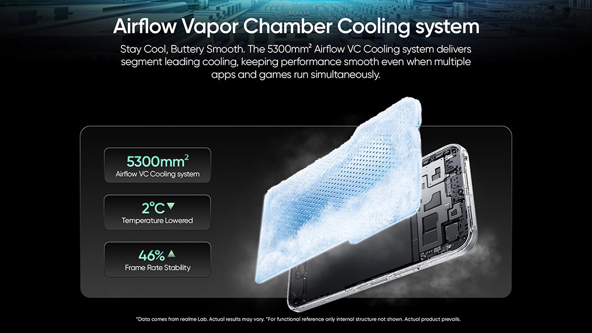 Về hiệu năng, smartphone này được trang bị chip Dimensity 6300, kết hợp với RAM "động" lên đến 14GB, đạt điểm số AnTuTu V11 trên 560,000. Hệ thống tản nhiệt Airflow Vapor Chamber với diện tích buồng hơi 5300mm² giúp giảm nhiệt độ xuống 2°C và tăng độ ổn định khung hình lên 46%.