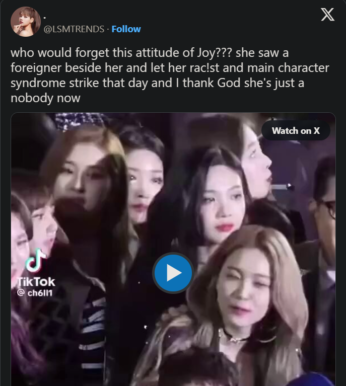 Tranh cãi trở nên căng thẳng hơn khi một tài khoản trực tiếp nhắc tên Joy, cho rằng nữ thần tượng có thái độ “thiếu thiện cảm” với Lisa tại một lễ trao giải trước đây. Tuy nhiên, cáo buộc này nhanh chóng vấp phải làn sóng phản đối mạnh mẽ từ cộng đồng fan hai bên. Nhiều ý kiến cho rằng việc cắt ghép khoảnh khắc ngắn ngủi trên sân khấu hay trong hậu trường để quy chụp thành vấn đề phân biệt chủng tộc là thiếu căn cứ và dễ gây tổn hại danh tiếng nghệ sĩ.