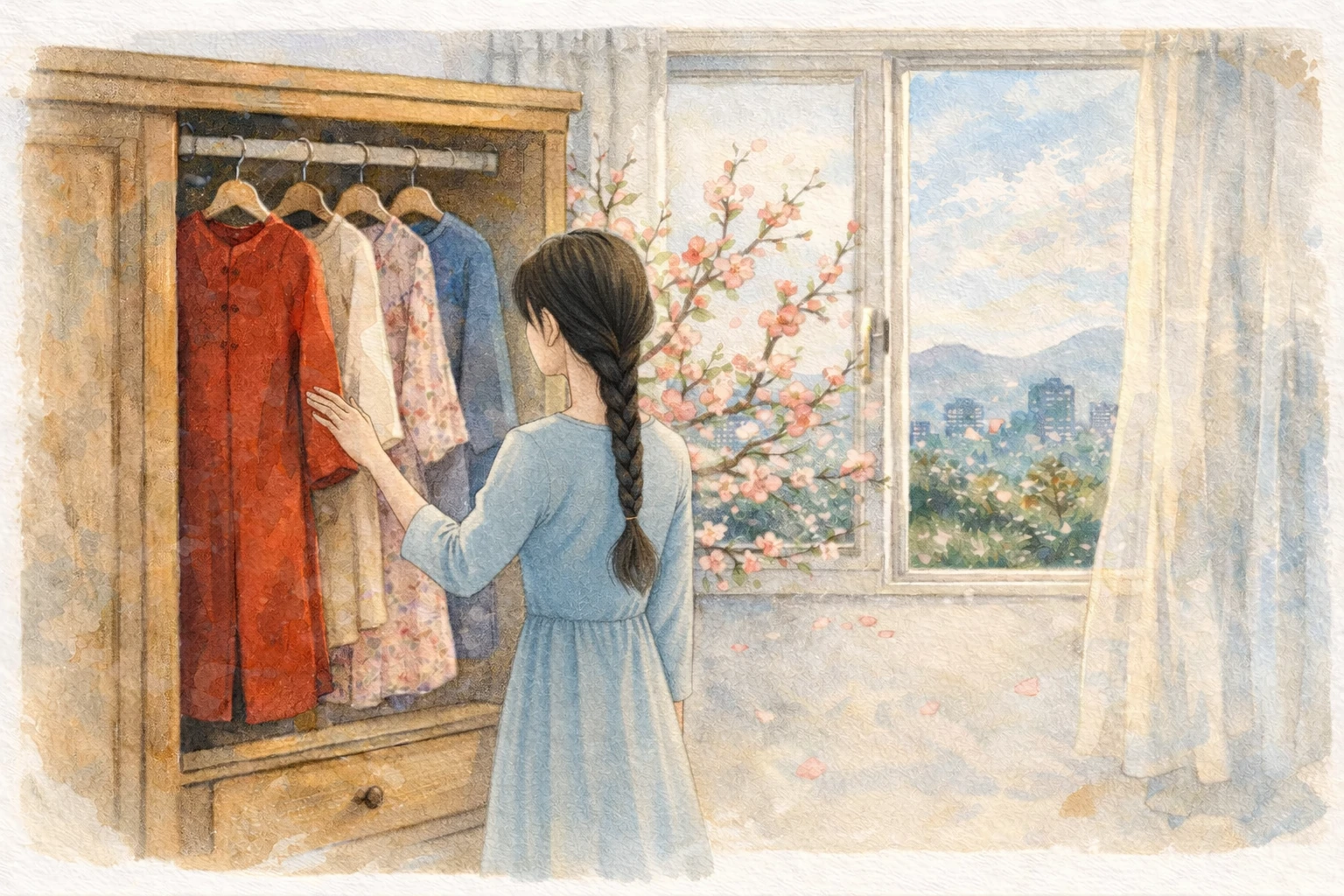 Tôi mở tủ quần áo. Mấy bộ đồ đẹp mặc đi chúc Tết vẫn còn treo đó như thể mùa xuân chỉ mới vừa chạm ngõ. Suốt những ngày qua, tôi được trở về là một đứa con nhiều hơn là một người lớn. Được ngủ nướng, được ngồi hàng giờ bên mâm cơm đông đủ, mẹ gắp cho món ngon, lắng nghe cha mẹ kể những câu chuyện của ngày xửa ngày xưa, khi tôi còn thơ bé.