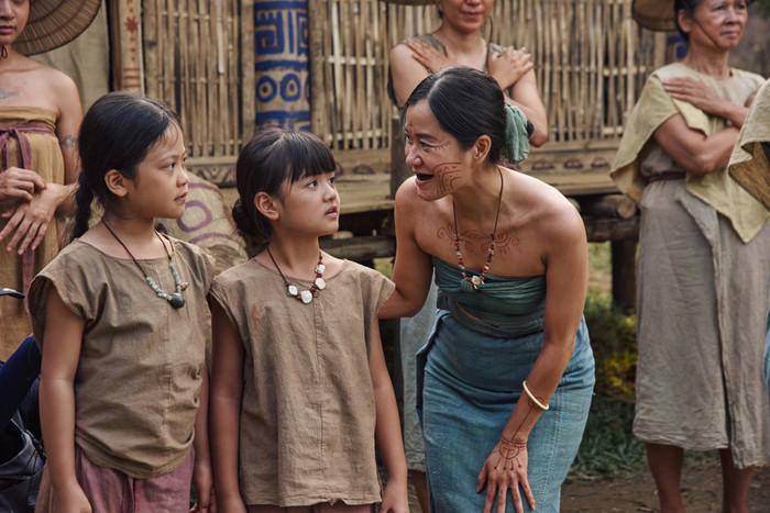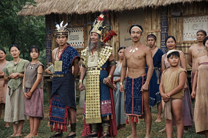 Không gian Việt cổ hiện lên dày đặc và nhất quán, từ trống đồng, thuyền gỗ, nhà ở giữa đầm lầy cho đến tục xăm mình, tô răng đen, cởi trần đóng khố.