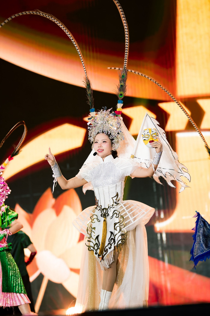 Các bộ trang phục của cô được thiết kế công phu, phối hợp hài hòa giữa yếu tố truyền thống và hiện đại, điều hiếm thấy ở các nghệ sĩ Gen Z. Mỗi outfit dường như đều kể một câu chuyện riêng, giúp cô không chỉ hát bằng giọng mà còn trình diễn bằng hình ảnh.