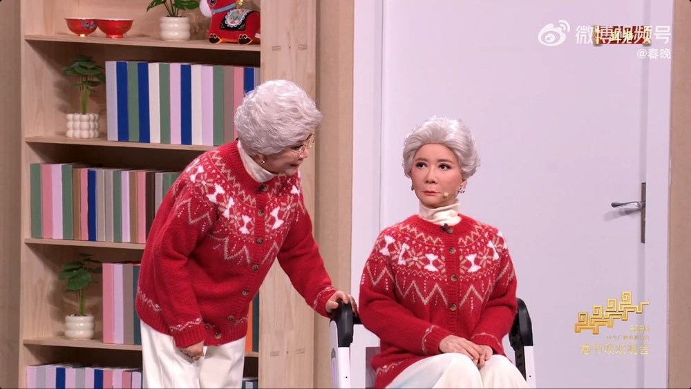 Robot hình người sinh học của Noetix (bên phải) bắt chước ngoại hình của Cai Ming trong vở hài kịch ngắn "Bà nội yêu thích". Ảnh chụp màn hình từ chương trình Gala Tết Nguyên đán 2026 của CCTV