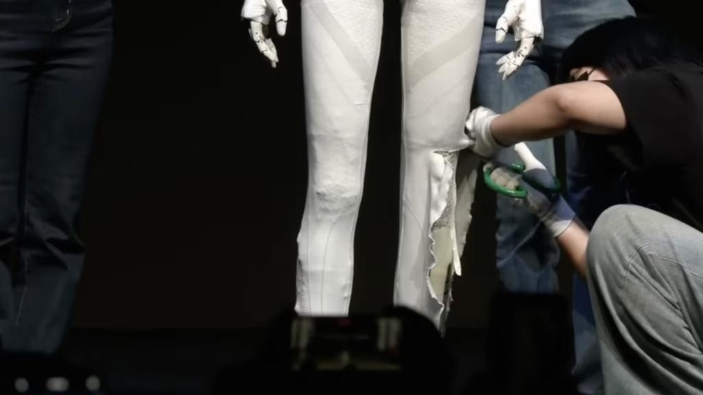 CEO XPeng, ông He Xiaopeng, đã mở khóa trang phục và cắt lớp bọc để lộ cấu trúc cơ khí bên trong.