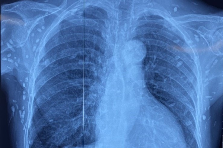 Nhiều nốt cản quang dưới da thành ngực, bụng và chi trên. Ảnh: BVCC