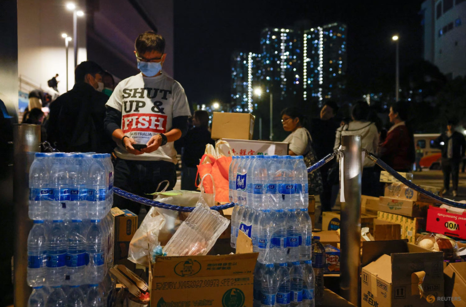 Người dân bên vật dụng cứu trợ cho người sơ tán sau vụ cháy chung cư Wang Fuk Court tại Hồng Kông, ngày 27/11. (Ảnh: Reuters)
