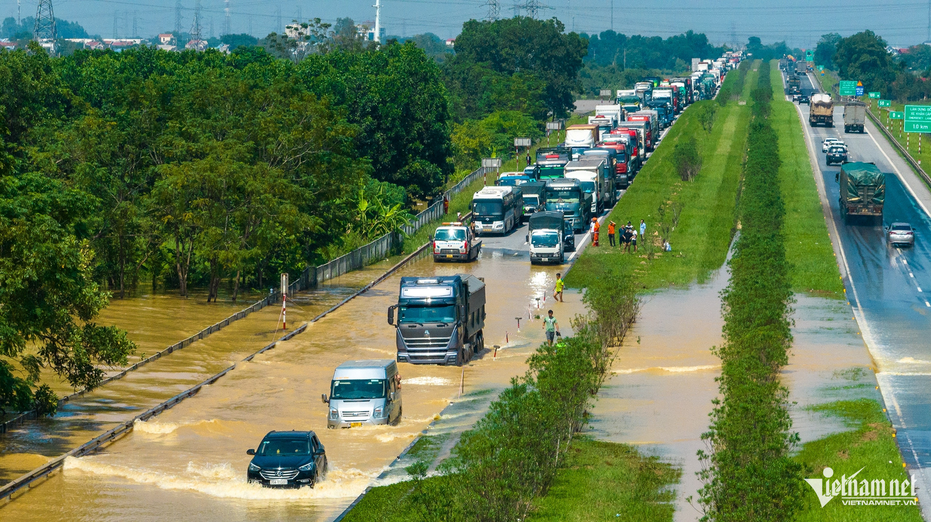 11h45 ngày 10/10 tại đoạn Km29 cao tốc Hà Nội - Thái Nguyên, hướng về địa phận Thủ đô, vẫn còn một đoạn dài chừng 100m bị ngập nước.