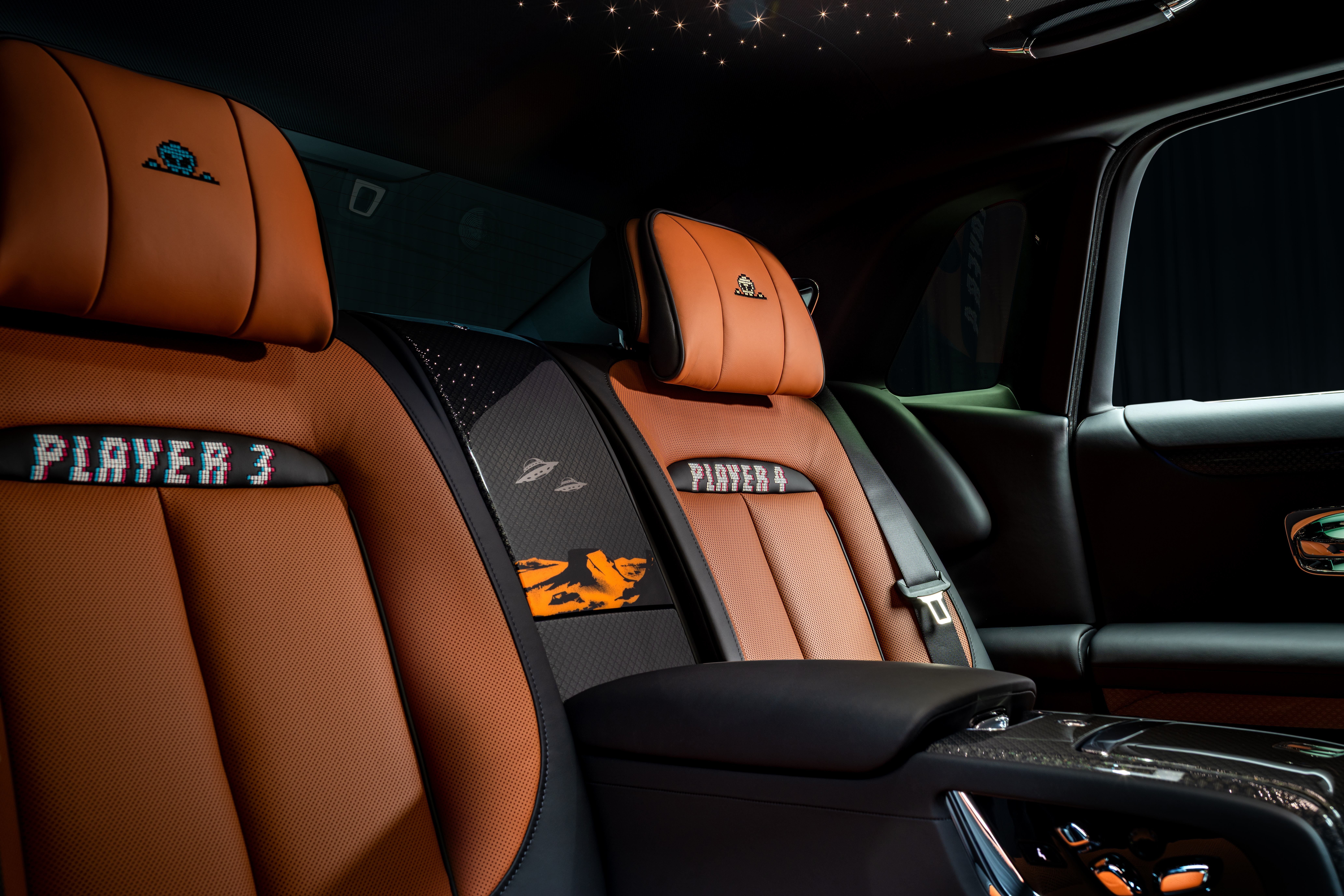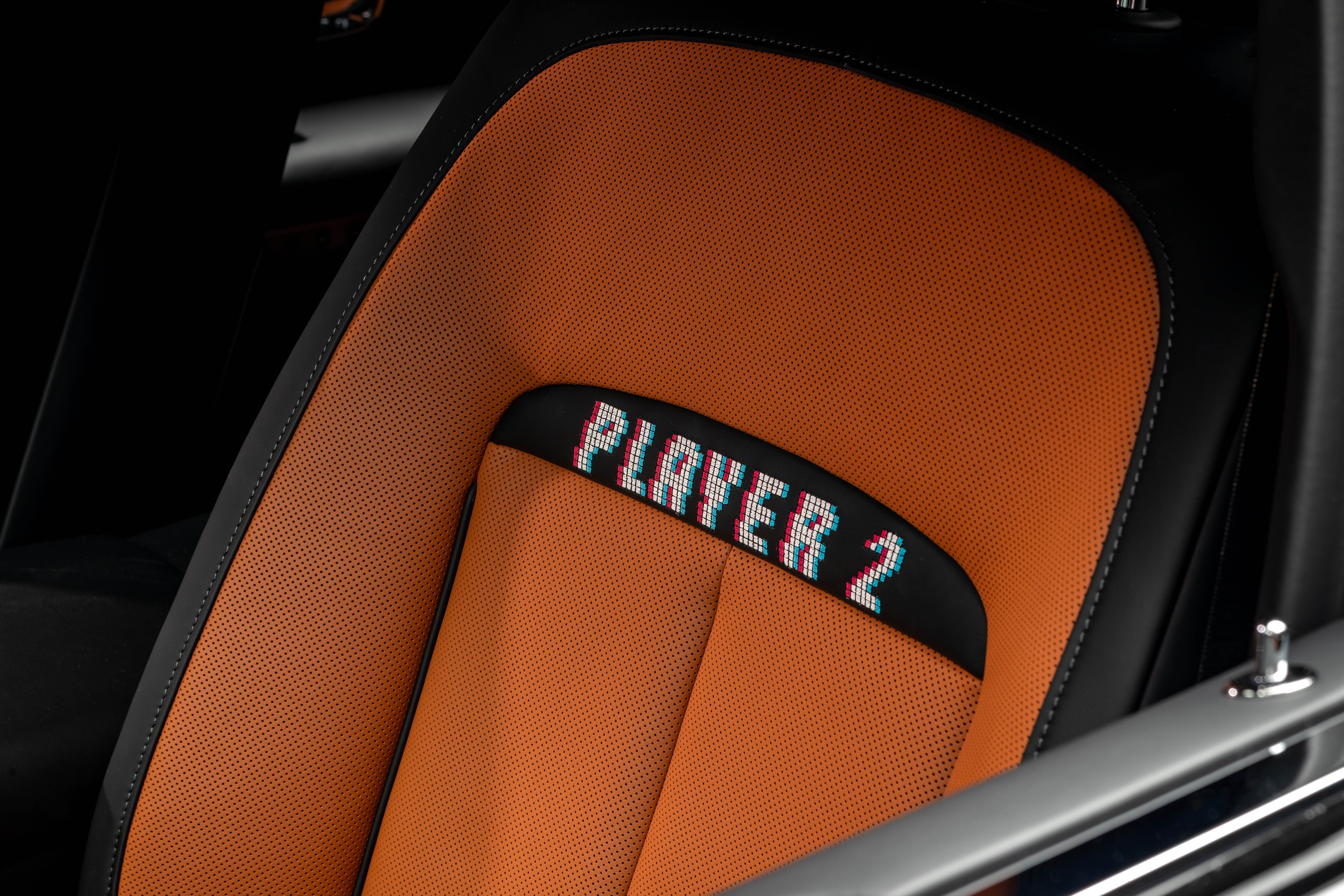 Ghế ngồi được bọc da màu đen và nâu Casden Tan, với logo "Player 1" và "Player 2" ở hàng ghế trước cùng "Player 3" và "Player 4" ở hàng ghế sau, mô phỏng giao diện khởi động của mỗi tựa game Arcade.