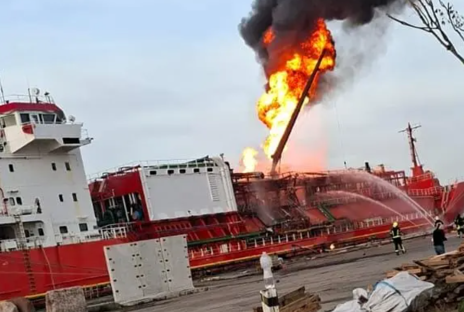 Tàu Orinda bốc cháy sau khi bị thiết bị bay không người lái của Nga tấn công tại thành phố cảng Izmail, tỉnh Odessa của Ukraine vào ngày 17/11. Ảnh: Tổng cục Hàng hải Thổ Nhĩ Kỳ/X